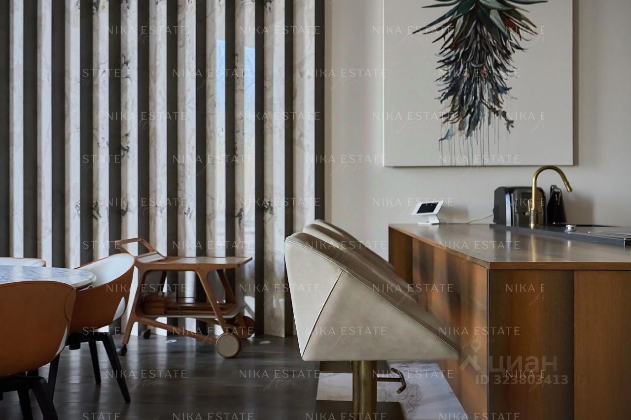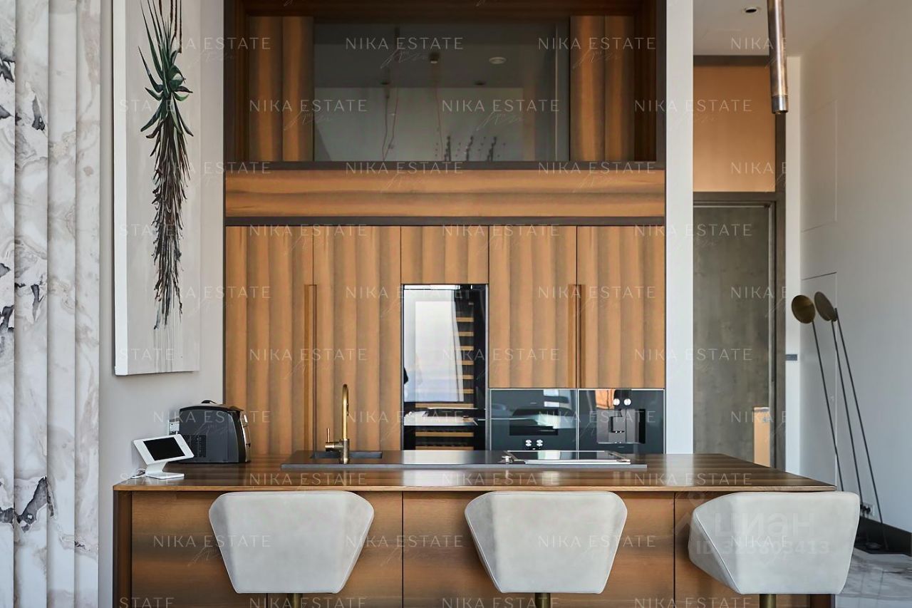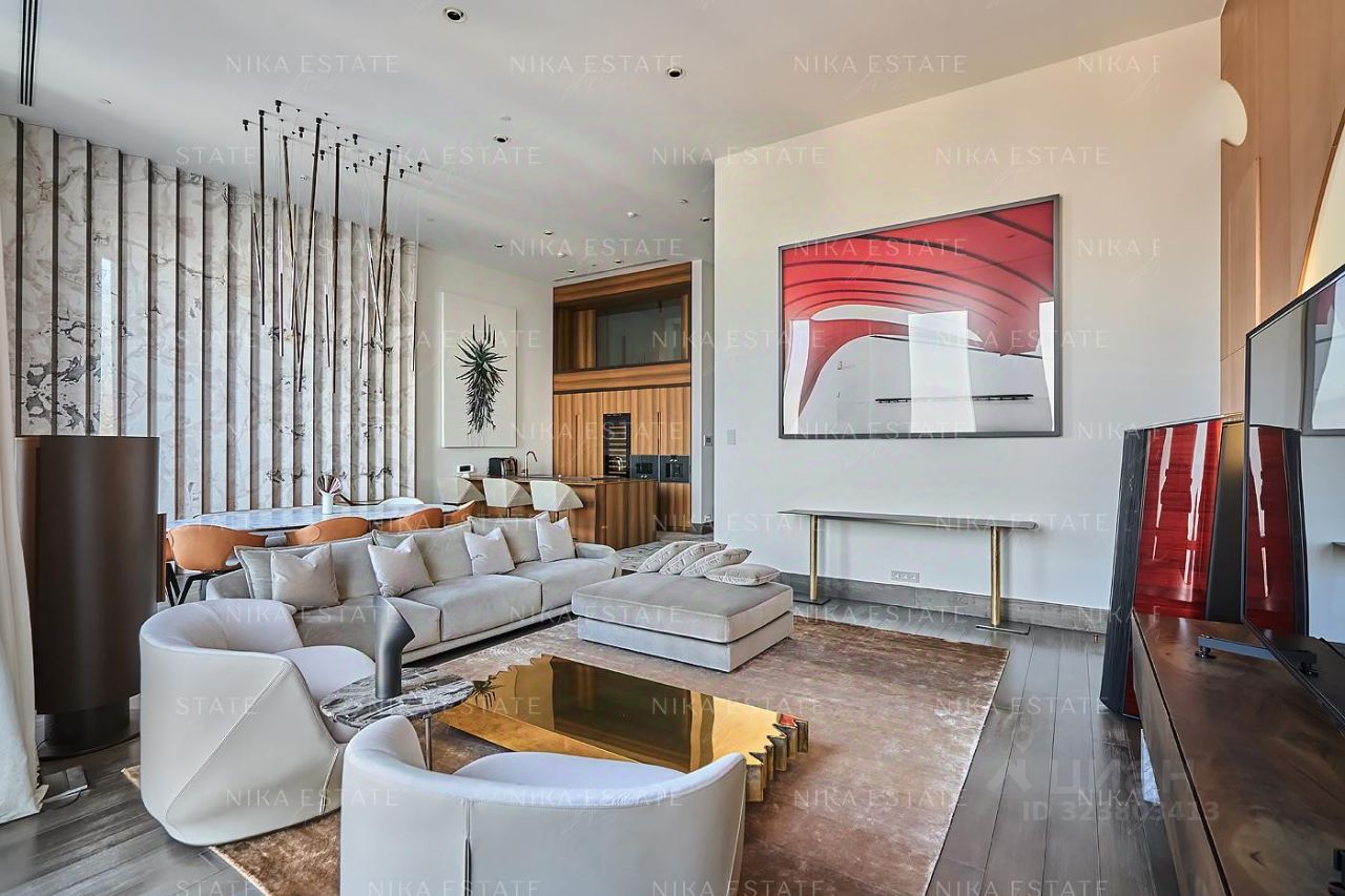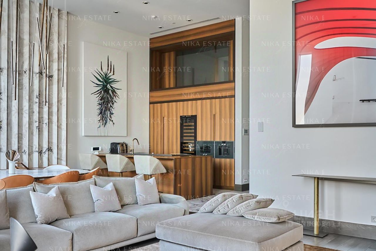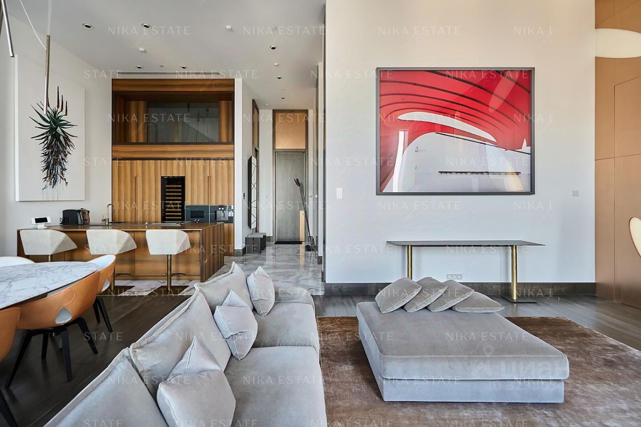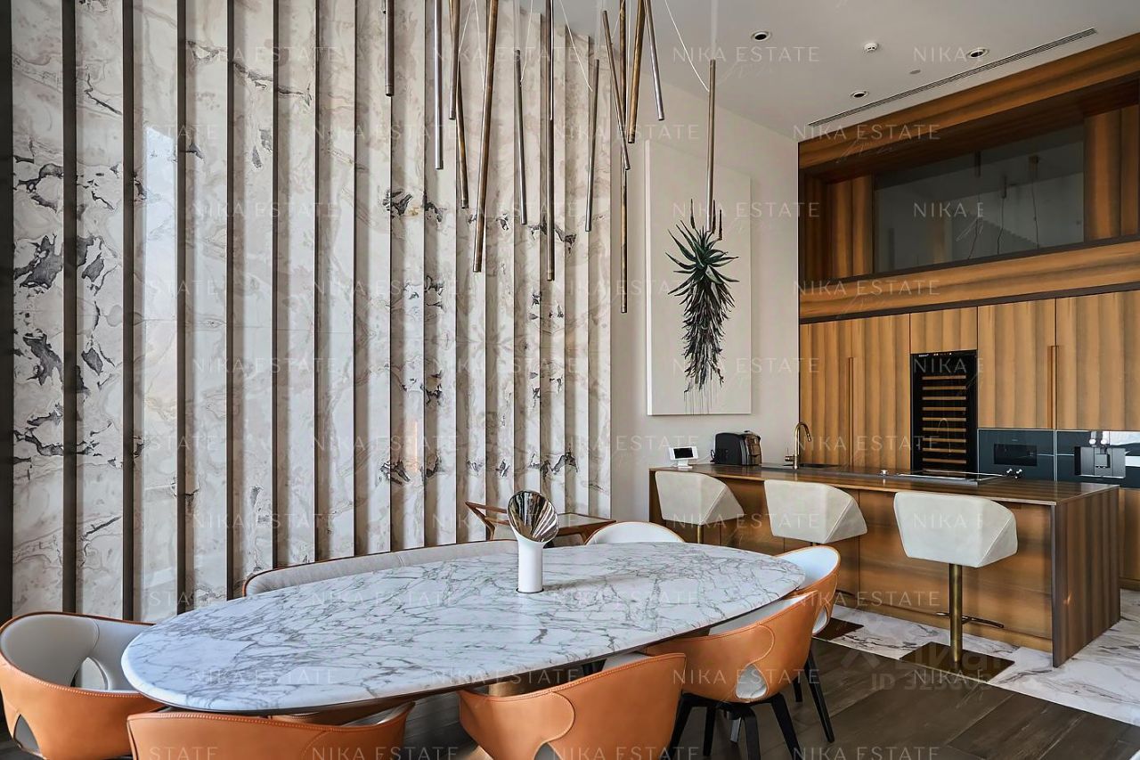 Уникальная. Именно это слово приходит в голову при виде этой квартиры. Квартиру разделили на две равные части: блок со спальней и ванной и зону гостиной с кухней и столовой зоной. Основная задача была сделать интерьер эффектным и вдохновляющим. Стена - перегородка с подсветкой в виде эллипсов между спальней и гостиной - яркий и знаковый элемент проекта. Интерьер довольно строг и лаконичен: тёмный пол, гладкие светлые стены, однотонный текстиль. В квартире хотели создать нечто, что разрушит жёсткую геометрию пространства, что-то необычное и молниеносно притягивающее взгляд. Кухня из окаменелого дерева по авторскому проекту. Изготовлена фабрикой Toncelli и облицована окаменелым деревом fossil. Благодаря своим особенным свойствам и прочности такое дерево можно использовать не только для фасадов, но и для рабочих поверхностей кухни. Световое окно над кухней пропускает дневной свет в гостевую ванную комнату. Барные стулья Hexagon, Henge. Живопись авторства Курта Пио. Стена в зоне столовой - настоящий арт-объект: это особенно спроектированная конструкция, грани которой облицованы мрамором Dover White и тонированным деревом. Стол Giorgetti.Стулья Poltrona Frau. Номер в базе: J27172