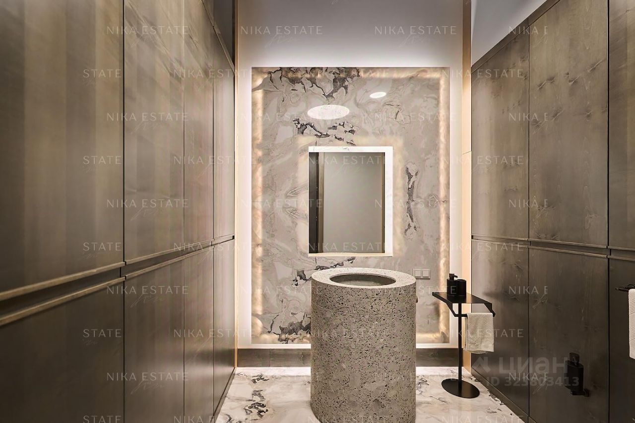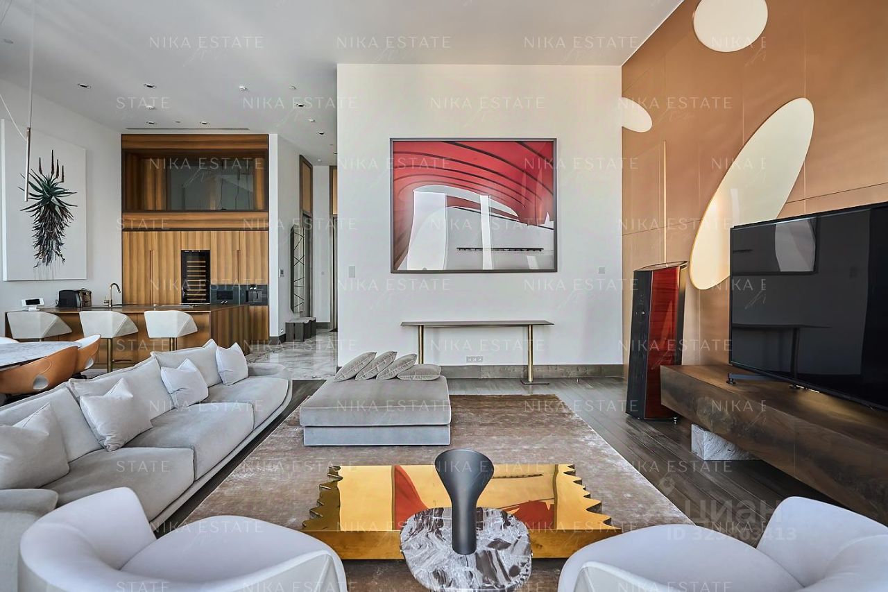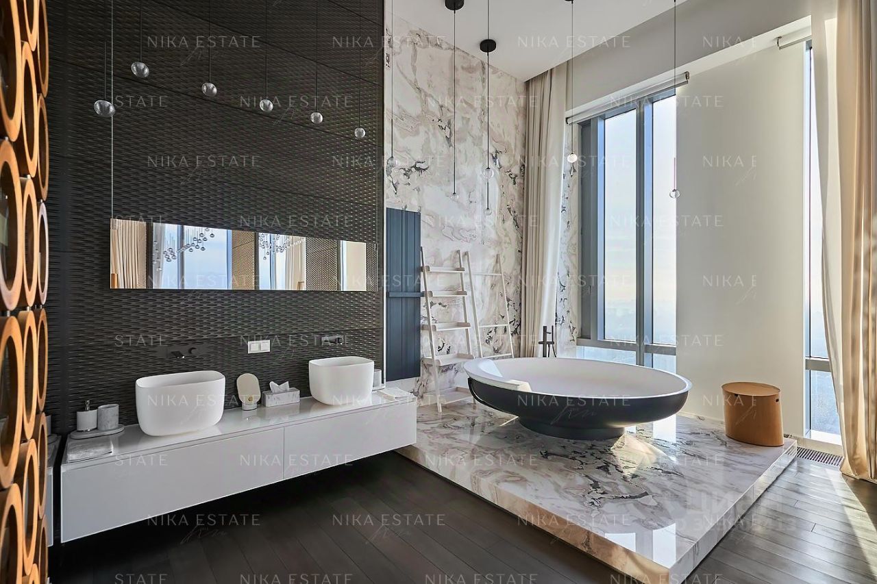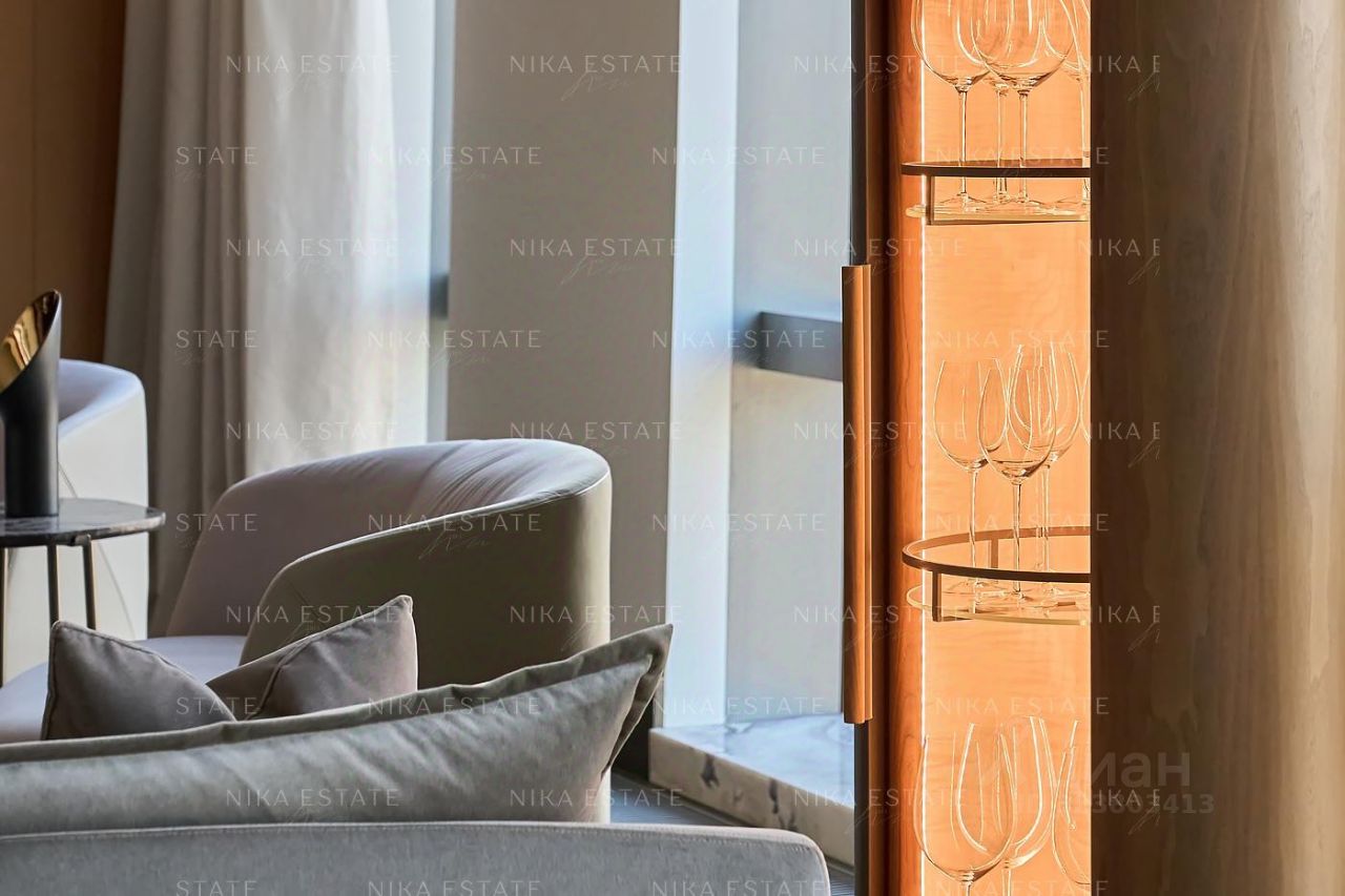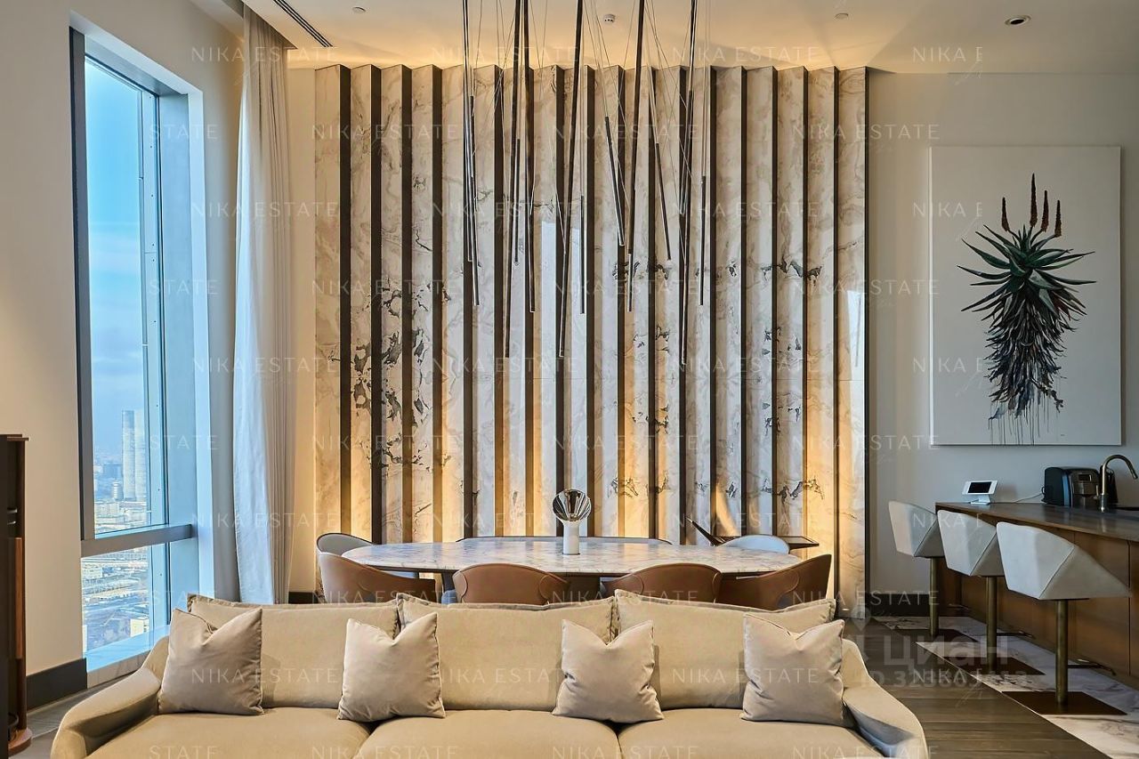 Уникальная. Именно это слово приходит в голову при виде этой квартиры. Квартиру разделили на две равные части: блок со спальней и ванной и зону гостиной с кухней и столовой зоной. Основная задача была сделать интерьер эффектным и вдохновляющим. Стена - перегородка с подсветкой в виде эллипсов между спальней и гостиной - яркий и знаковый элемент проекта. Интерьер довольно строг и лаконичен: тёмный пол, гладкие светлые стены, однотонный текстиль. В квартире хотели создать нечто, что разрушит жёсткую геометрию пространства, что-то необычное и молниеносно притягивающее взгляд. Кухня из окаменелого дерева по авторскому проекту. Изготовлена фабрикой Toncelli и облицована окаменелым деревом fossil. Благодаря своим особенным свойствам и прочности такое дерево можно использовать не только для фасадов, но и для рабочих поверхностей кухни. Световое окно над кухней пропускает дневной свет в гостевую ванную комнату. Барные стулья Hexagon, Henge. Живопись авторства Курта Пио. Стена в зоне столовой - настоящий арт-объект: это особенно спроектированная конструкция, грани которой облицованы мрамором Dover White и тонированным деревом. Стол Giorgetti.Стулья Poltrona Frau. Номер в базе: J27172