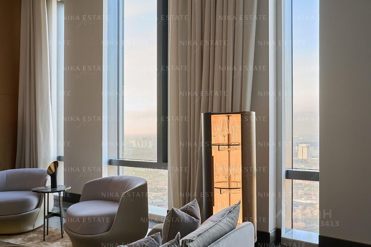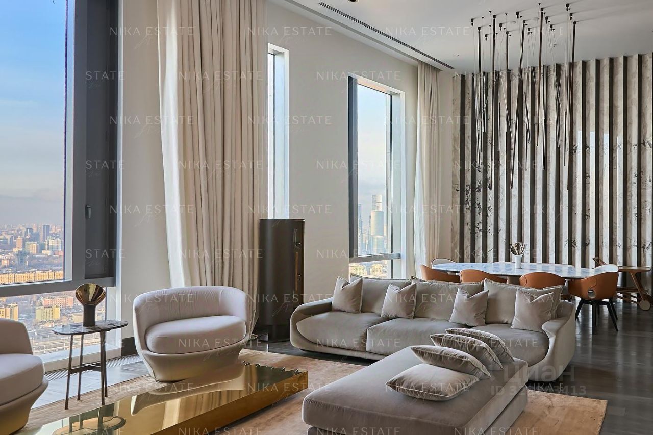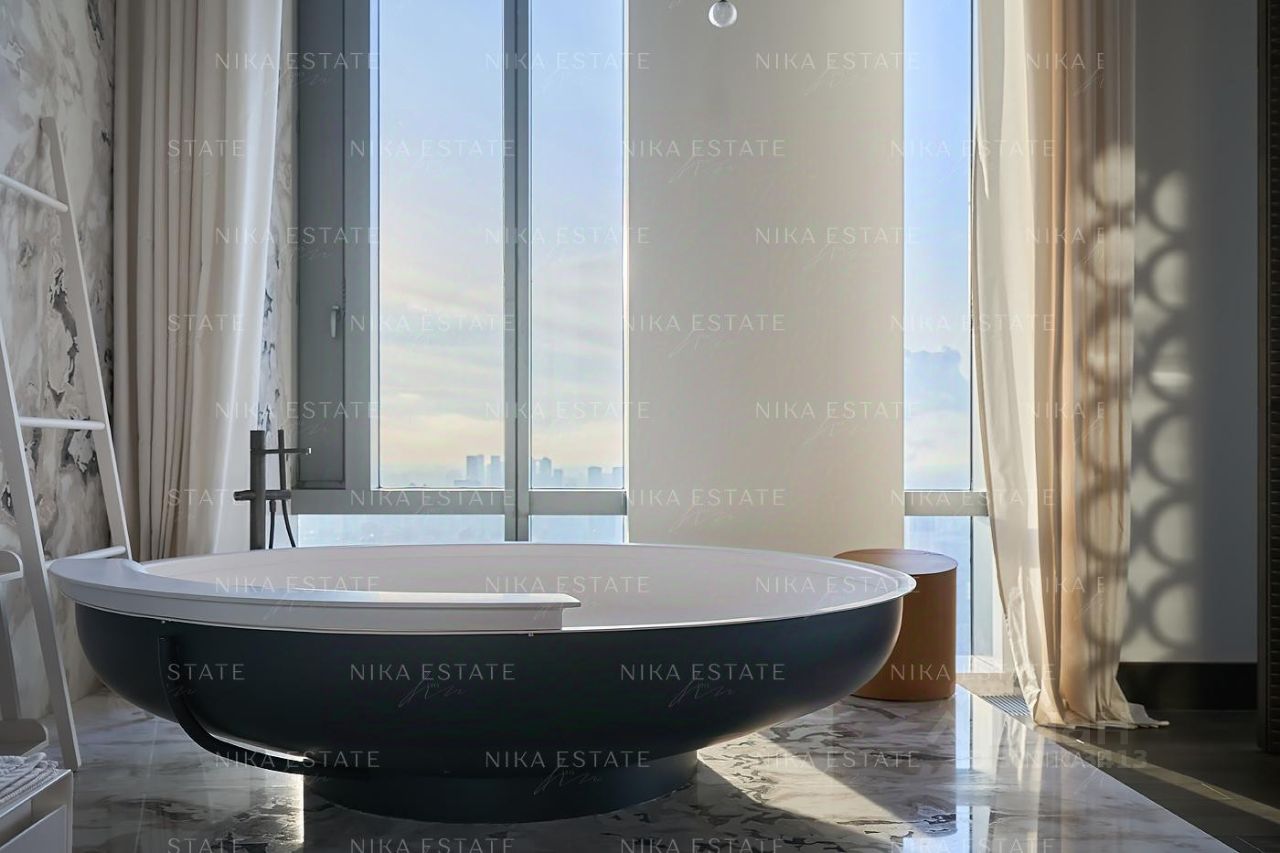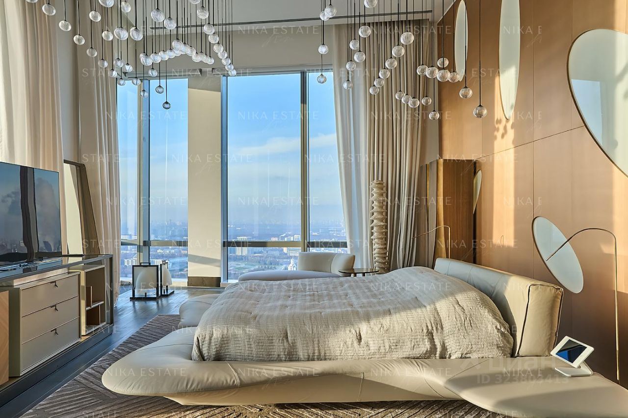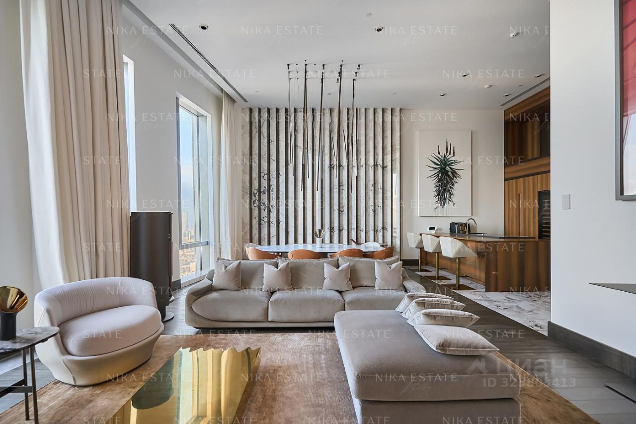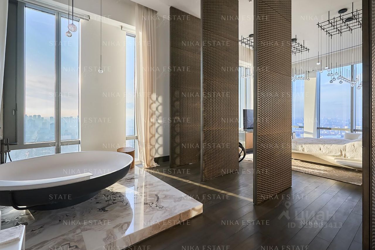Уникальная. Именно это слово приходит в голову при виде этой квартиры. Квартиру разделили на две равные части: блок со спальней и ванной и зону гостиной с кухней и столовой зоной. Основная задача была сделать интерьер эффектным и вдохновляющим. Стена - перегородка с подсветкой в виде эллипсов между спальней и гостиной - яркий и знаковый элемент проекта. Интерьер довольно строг и лаконичен: тёмный пол, гладкие светлые стены, однотонный текстиль. В квартире хотели создать нечто, что разрушит жёсткую геометрию пространства, что-то необычное и молниеносно притягивающее взгляд. Кухня из окаменелого дерева по авторскому проекту. Изготовлена фабрикой Toncelli и облицована окаменелым деревом fossil. Благодаря своим особенным свойствам и прочности такое дерево можно использовать не только для фасадов, но и для рабочих поверхностей кухни. Световое окно над кухней пропускает дневной свет в гостевую ванную комнату. Барные стулья Hexagon, Henge. Живопись авторства Курта Пио. Стена в зоне столовой - настоящий арт-объект: это особенно спроектированная конструкция, грани которой облицованы мрамором Dover White и тонированным деревом. Стол Giorgetti.Стулья Poltrona Frau. Номер в базе: J27172