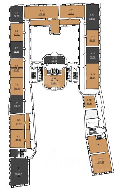 Этот лот состоит из нескольких помещений: 172 кв. м., 132 кв. м. и 176 кв. м.