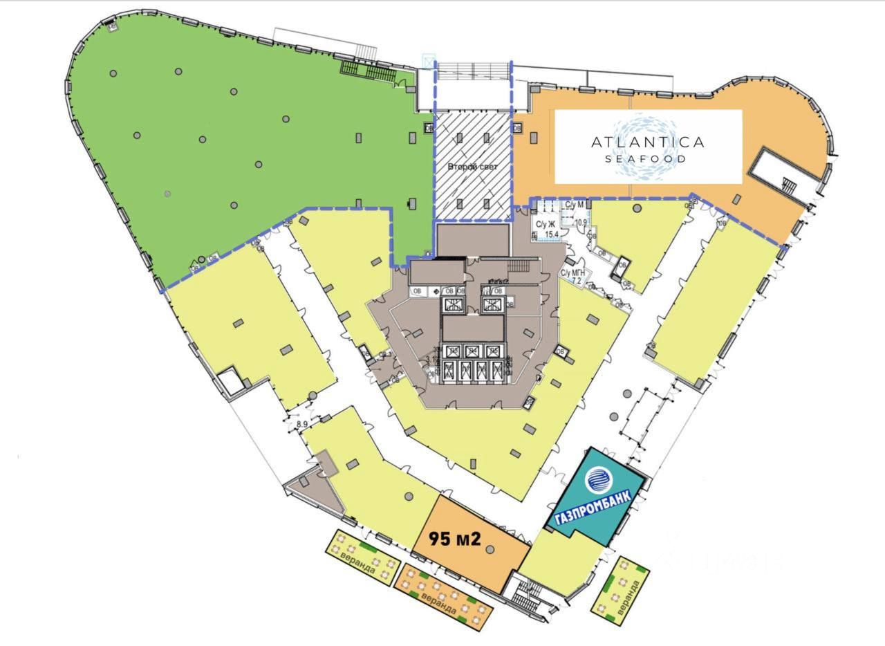 Объект площадью 95 м2 на 1 этаже. Высокие потолки-6 м, витринное остекление в пол, свободная планировка, все коммуникации центральные, мощность по запросу. Есть место для просторной летней веранды, на фасаде предусмотрена возможность размещения рекламы.