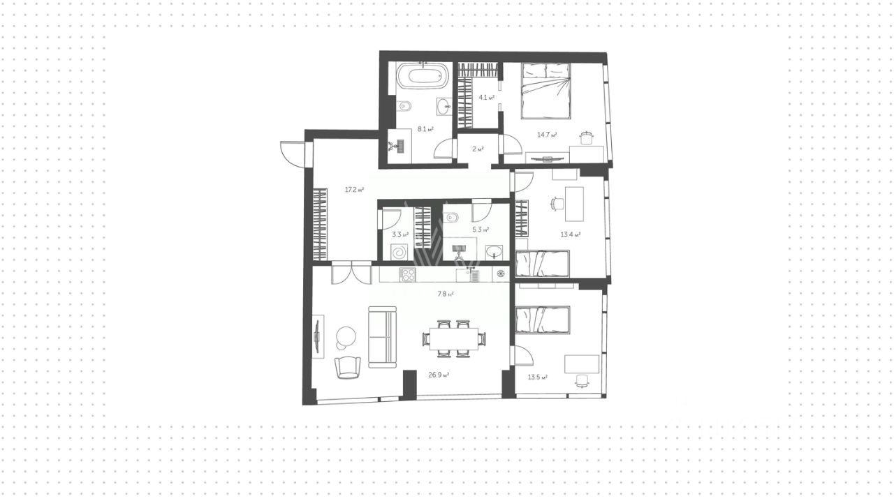 *Функциональная планировка* * Кухня-гостиная с обеденной зоной — идеальное пространство для гастрономических экспериментов и приёма гостей. Здесь легко представить вечера с бокалом вина и неторопливые беседы у телевизора. * Изолированная мастер-спальня с собственной ванной и гардеробной становится личной территорией восстановления сил. Пробуждение здесь наполнено мягким светом и видами на зелень. * Две дополнительные спальни могут служить детскими комнатами, кабинетами для работы в тишине или гостевыми апартаментами. * Практичная постирочная и холл с интегрированными системами хранения завершают картину продуманного быта.
