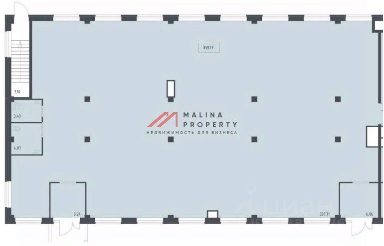 Помещение 359,17 м2 располагается на 1 этаже в стилобате на въезде в ЖК, открытая планировка, два входа и зона разгрузки, высота потолка 4 м, витринные окна по фасаду. Электрическая мощность 65 кВт. Парковка перед фасадом. Место для размещения рекламы.