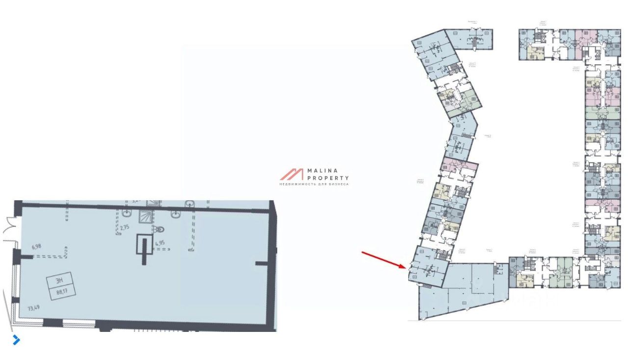 Помещение 88,17 располагается на 1 этаже, открытая планировка, отдельный вход с фасада, высота потолка 4,5 м, электрическая мощность 16 кВт, витринные окна по фасаду. Помещение будет с ремонтом от арендатора.