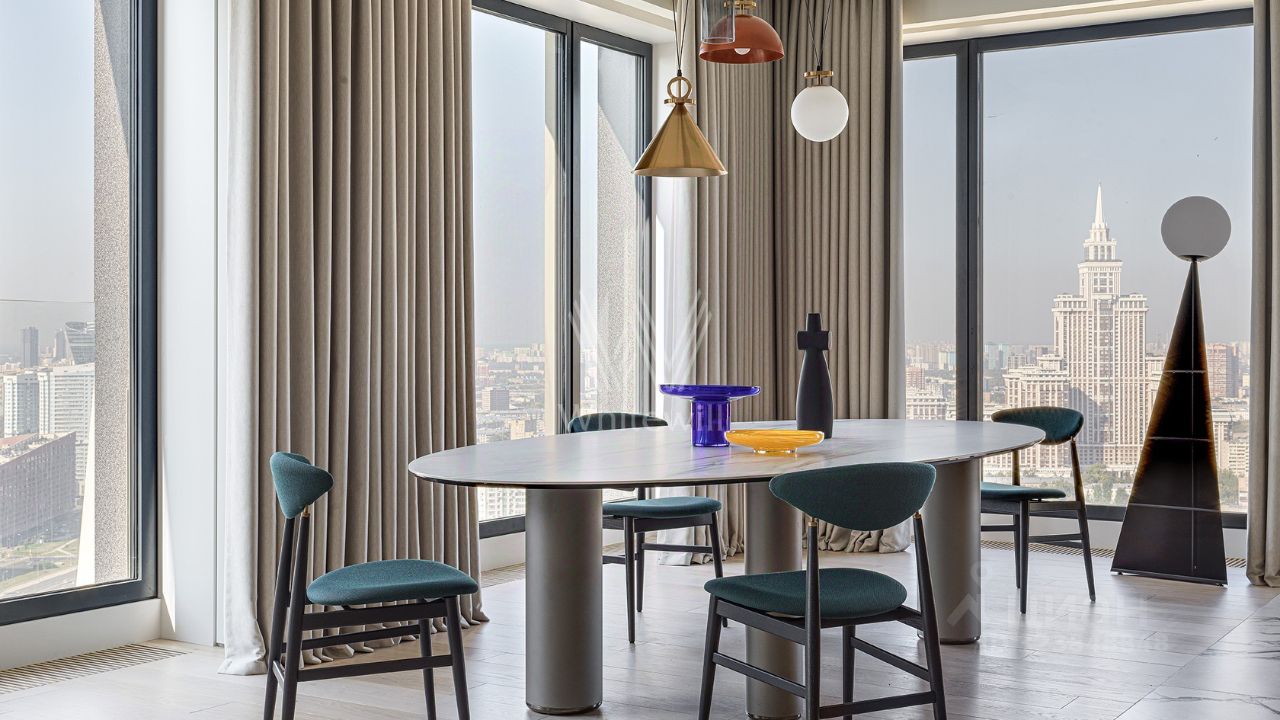 Просторная квартира площадью 287 м² в комплексе премиум-класса Prime Park. С высоты тридцать пятого этажа открываются захватывающие виды на Москву. Интерьер выполнен в стиле современного минимализма по проекту AB-Architects. Четкие геометрические линии, тактильные материалы и игра света и воздуха создают атмосферу спокойствия и гармонии.