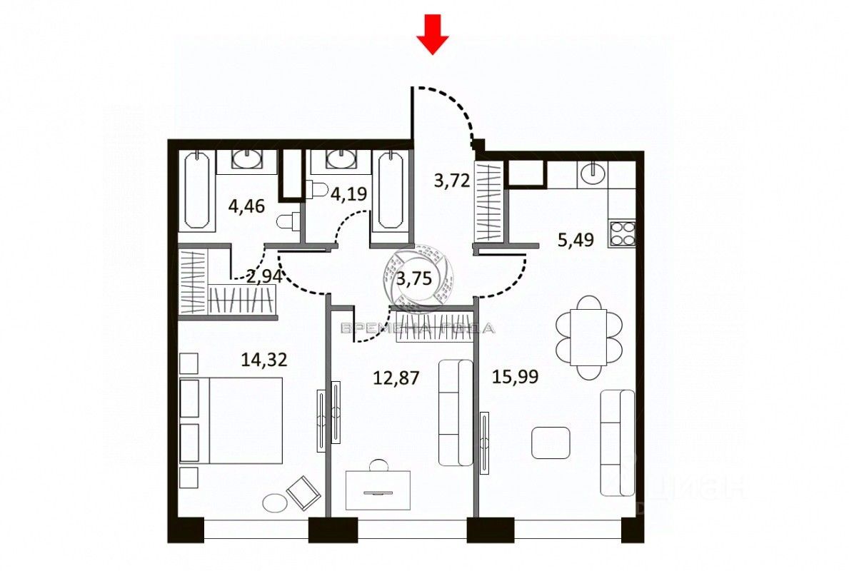 Планировочное решение: кухня с обеденной зоной и гостиной, две спальни, два санузла, гардеробные, холл