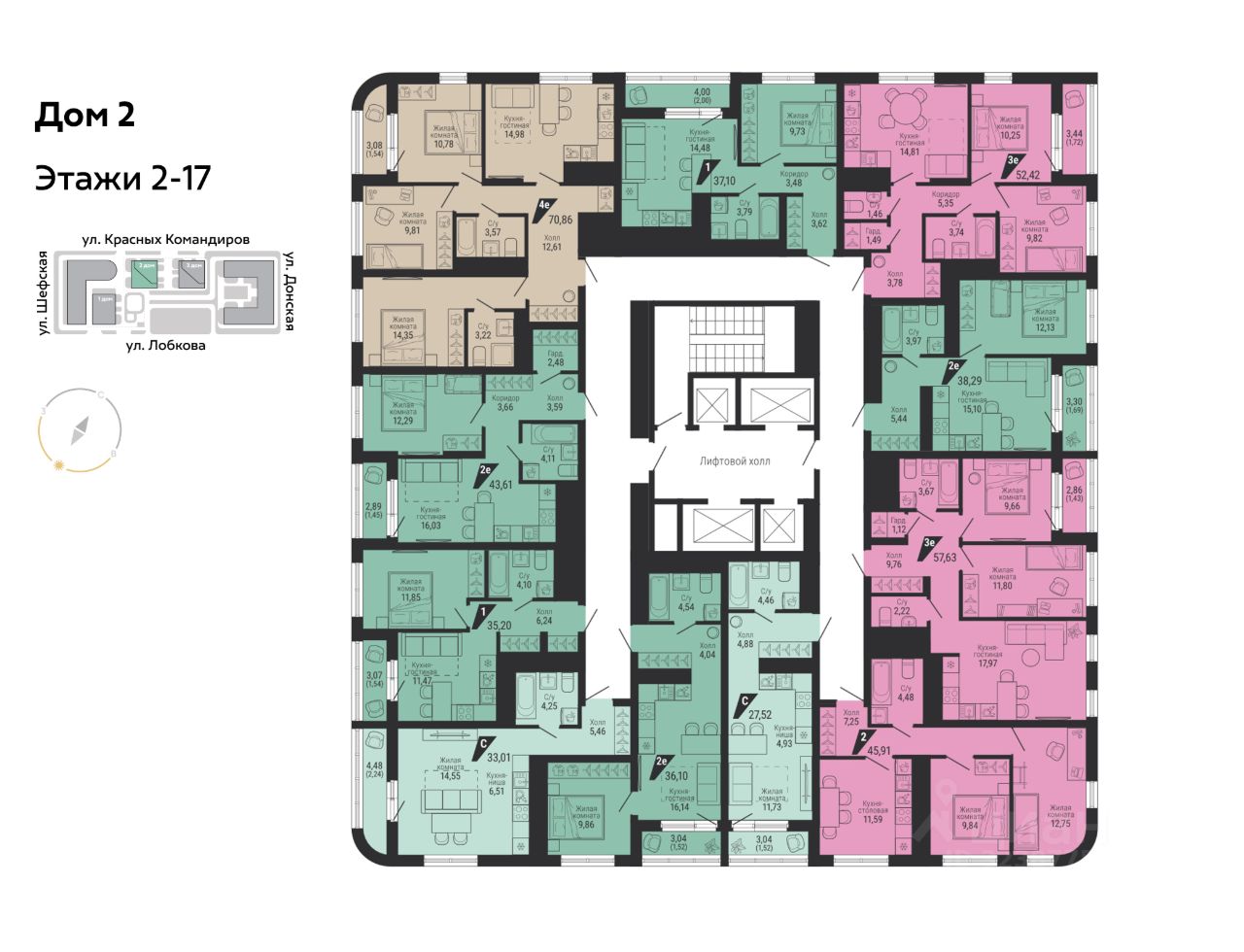 На этаже располагается от четырех квартир, площади от 27 до 81 кв. м. Есть евро и классические планировки, а таже квартиры с личными террасами. Кухни-гостиные становятся местом сбора всей семьи, мастер-спальни располагаются в стороне от детских. В больших квартирах предусмотрено несколько санузлов и гардеробные. Во всех планировках второй очереди есть лоджии, где можно обустроить дополнительные зоны для работы или отдыха.