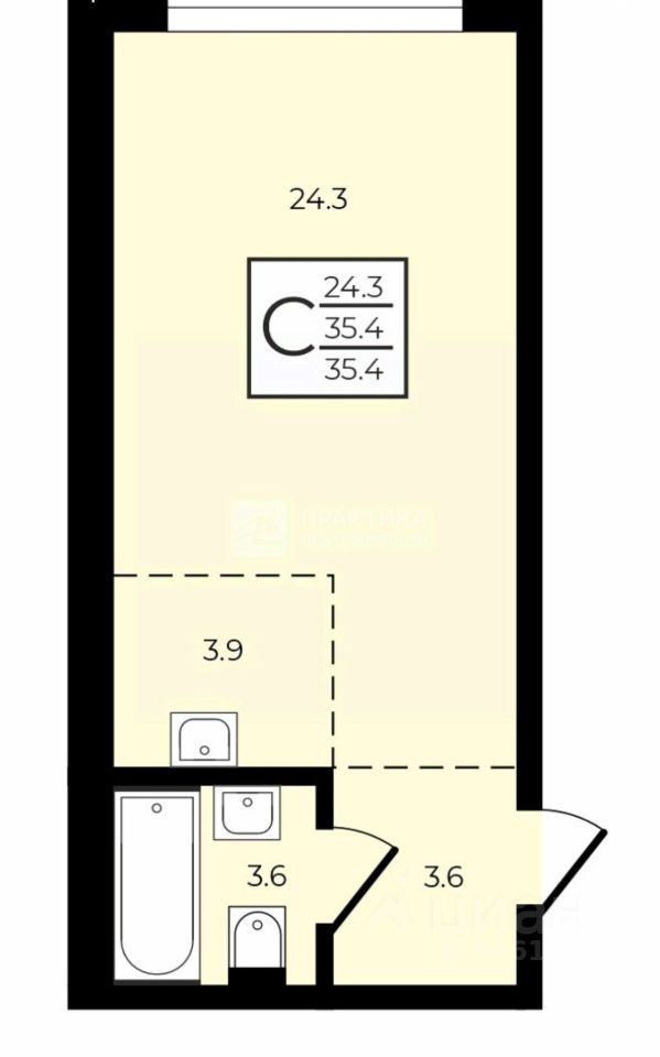 Общая площадь квартиры — 35,4 кв. м, жилая — 24,3 кв. м. Также есть кухня площадью 4 кв. м. В квартире один совмещённый санузел. Квартира без отделки, что даёт возможность новому владельцу воплотить свои дизайнерские идеи.