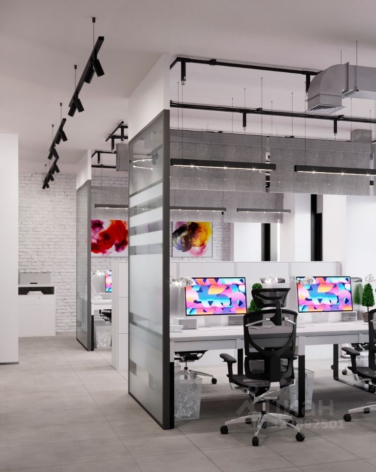 Помещение с отделкой (заканчивается ремонт, на фото представлена визуализация). Планировка смешанная: 2 кабинета, опенспейс, зона ресепшн. Сан узлы на этаже.