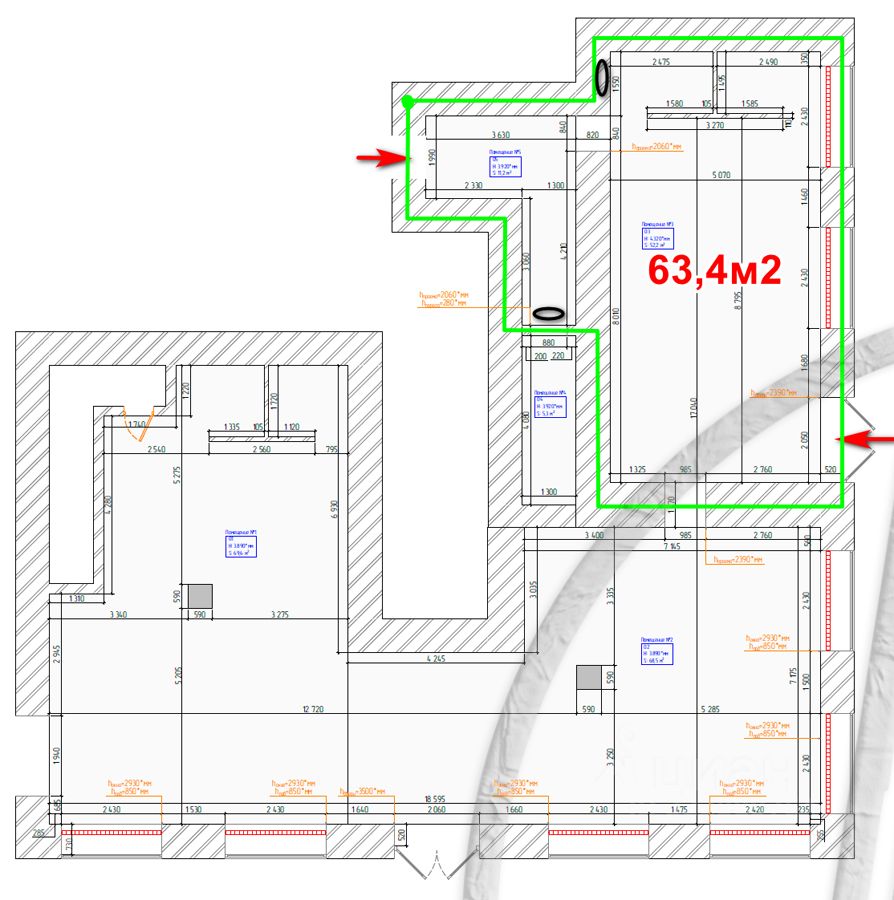 Площадь помещения - 63,4 кв.м (1/8 этаж)