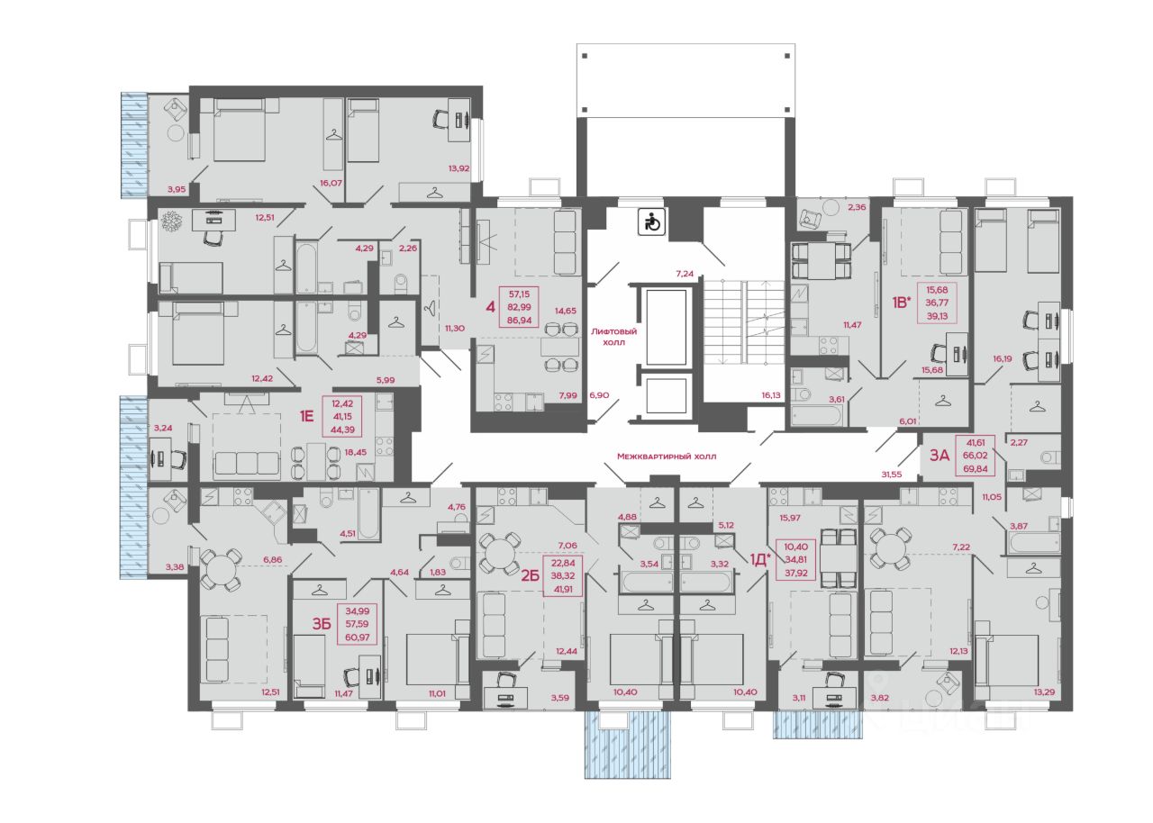 квартиры площадью от 27,34 до 86,94 м² электроразводка внутри квартир установлены розетки и выключатели оконные блоки из ПВХ с двойным стеклопакетом индивидуальные корзины для кондиционеров
