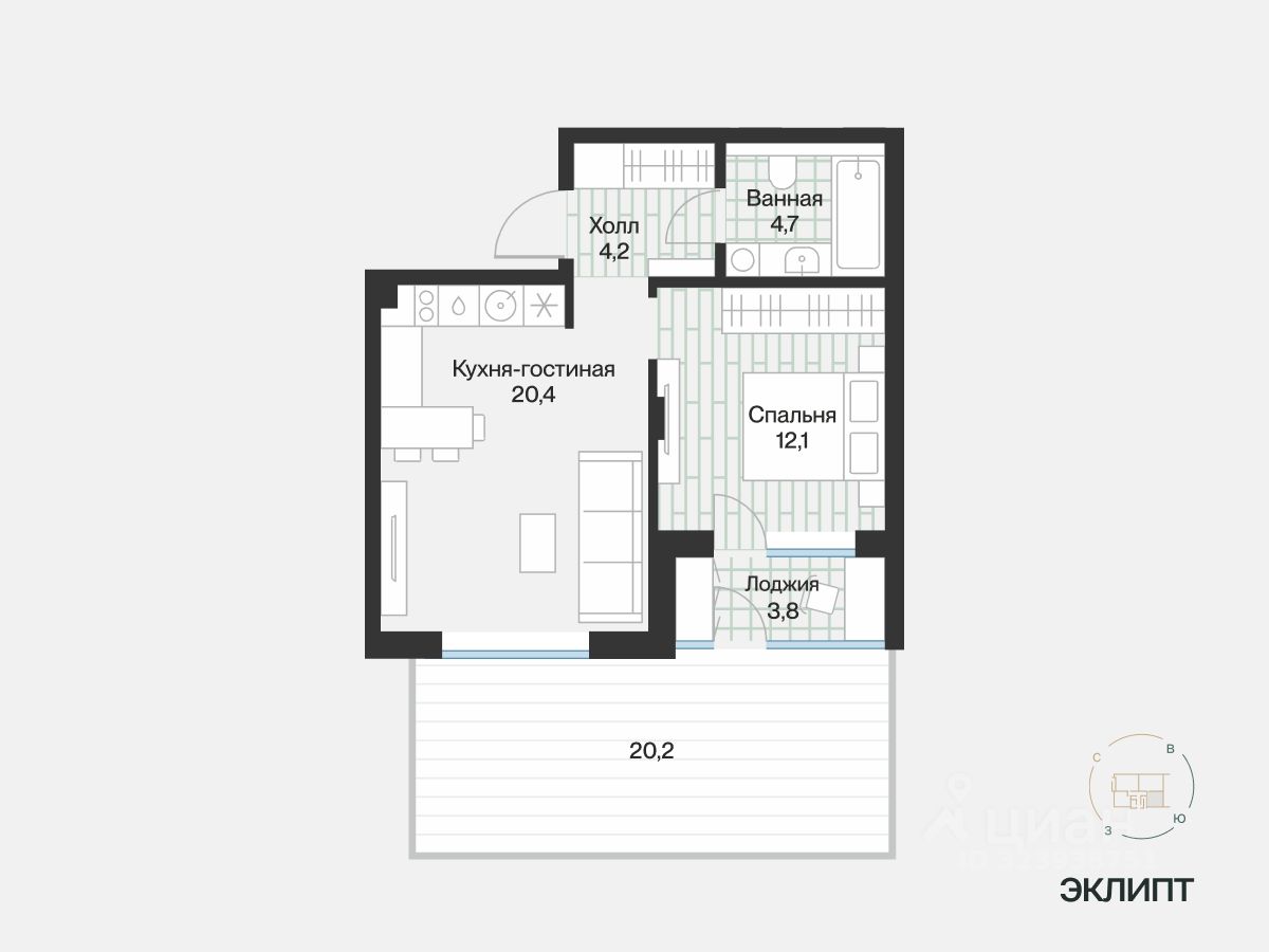 Квартира с урбан-садом. Это прилегающий к дому участок, где летом можно поставить плетёную мебель и выходить, чтобы почитать книгу. Зимой — выпить горячий шоколад на свежем воздухе. Выход в урбан-сад через лоджию в спальне.