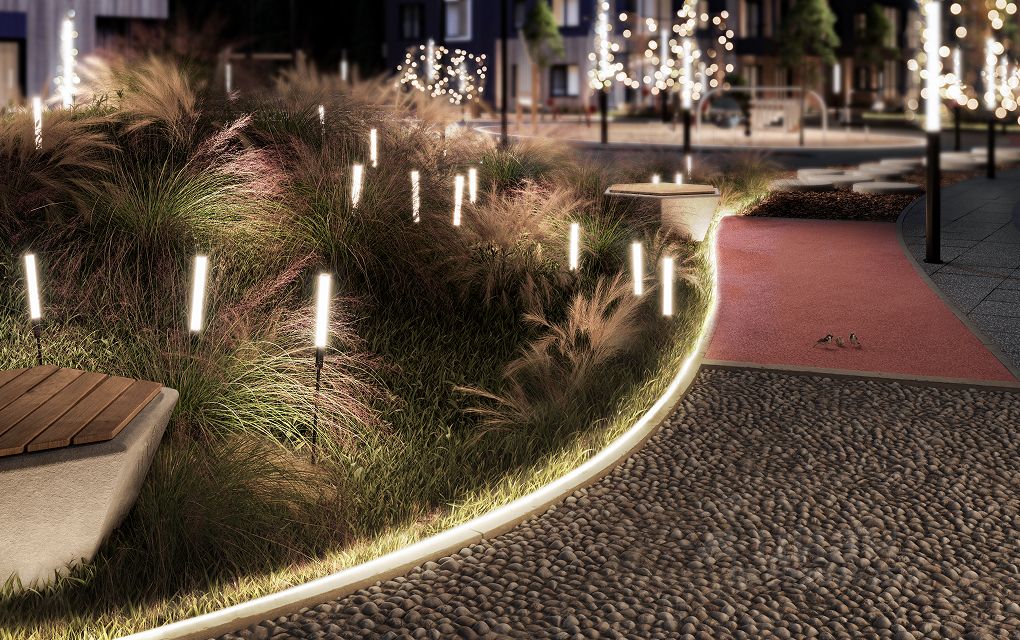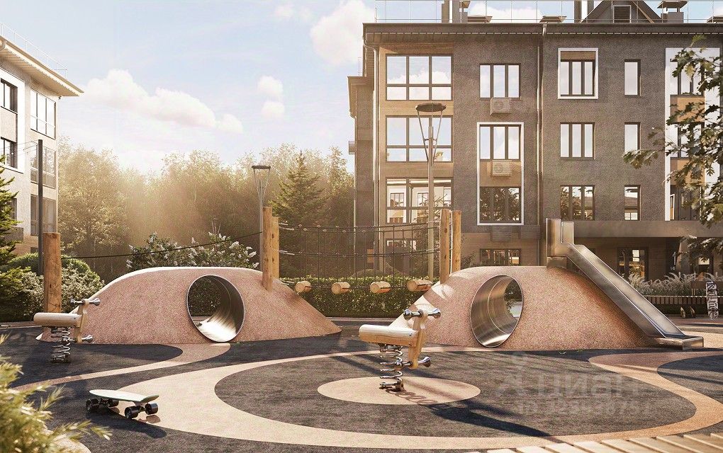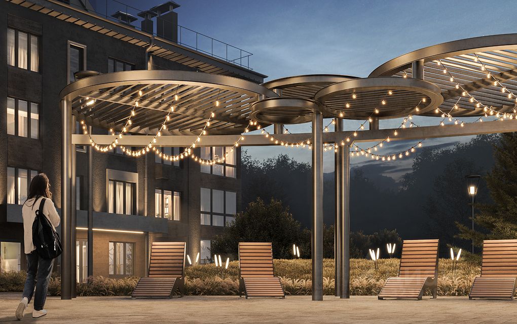 Дворы — закрыты от машин. Внутри: нейродинамические детские площадки, шезлонги для отдыха и перголы с гирляндами.