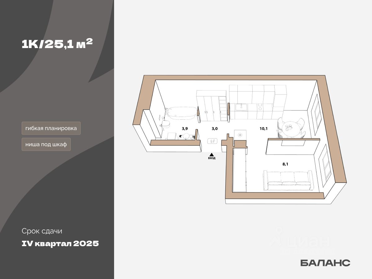 Однокомнатная квартира без лишних метров — хороший вариант для первой покупки. В прихожей продумана ниша под шкаф-купе. Планировка гибкая: кухню можно объединить со спальней, чтобы создать больше пространства.