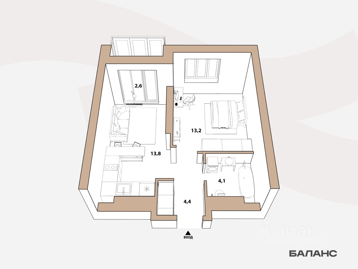Планировка с отдельной спальней. В просторной кухне-гостиной выход на панорамную лоджию — окна рядом с ней в пол. Для хранения вещей в прихожей подготовлена ниша под шкаф-купе.