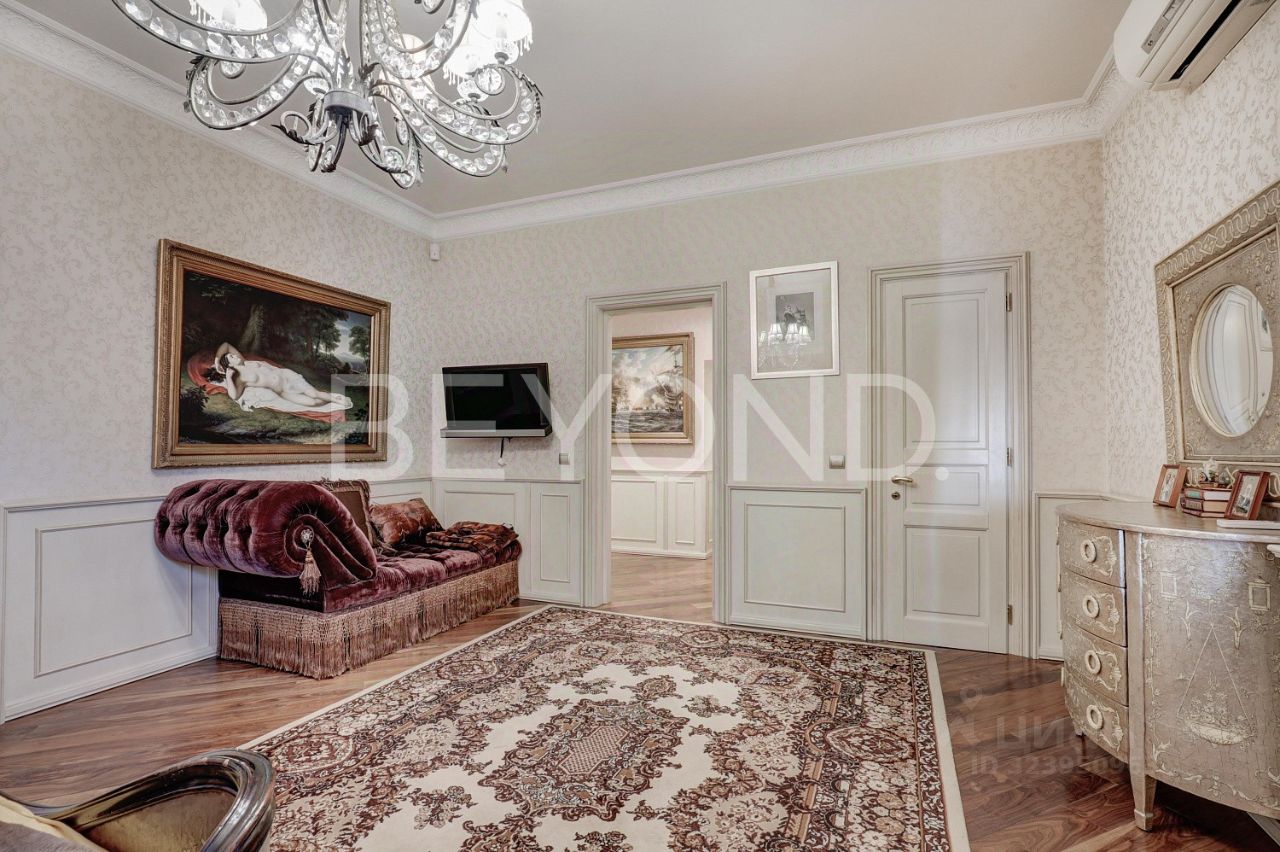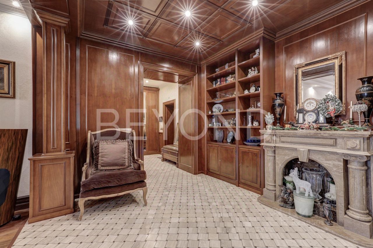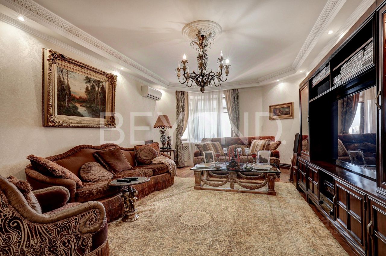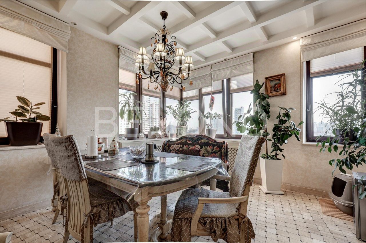 Предлагается к продаже видовая квартира 171 кв. м с отделкой на 11-м этаже в жилом комплексе на Юго-Западе Москвы. Планировка квартиры включает просторную зону гостиной, отдельную зону кухни-столовой, мастерспальню со своей ванной комнатой и гардеробной, гостевую спальню с ванной комнатой, кабинет, гостевой санузел. Отделка квартиры выполнена в стиле английской классики с использованием натуральных материалов: мрамора, травертина, древесины орехового дерева (паркетная доска и панели), шелка (обои). В ванных комнатах установлена сантехника английских и немецких брендов премиум класса DevonDevon, VilleroyBoch, на кухне бытовая техника Miele и Kuppersbusch. Из окон квартиры открываются панорамные виды на парк и прилегающую территорию.