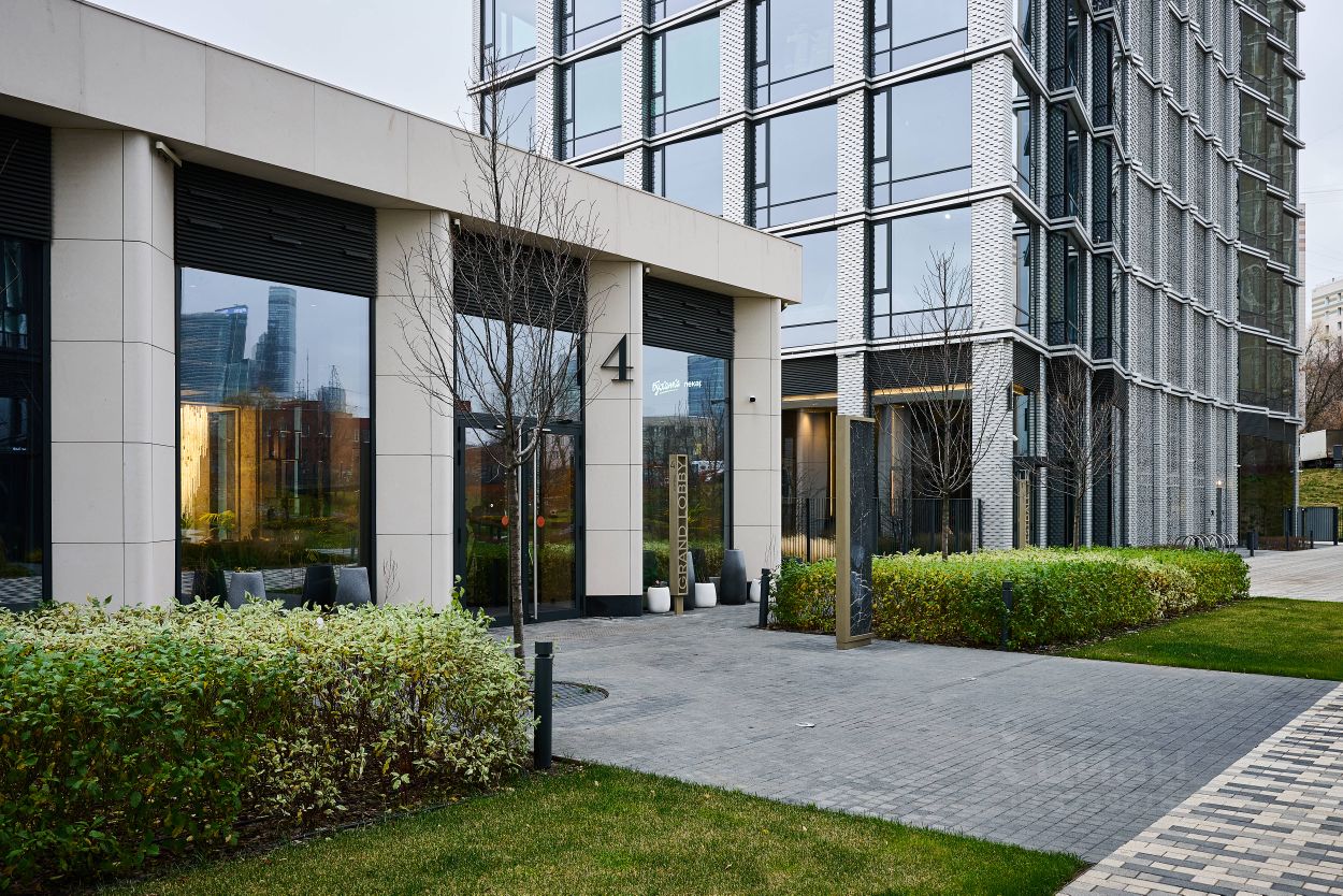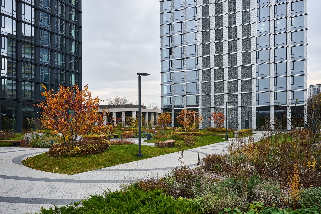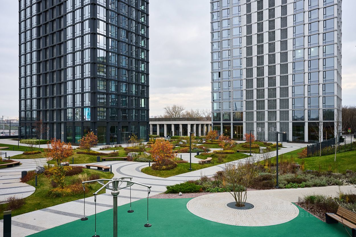 Центральное фойе с лобби-баром и камином, благоустройство территории с продуманным зонированием- детские площадки, workout-зона, собственный английский сад. Смотровая площадка на крыше каждого из корпусов.
