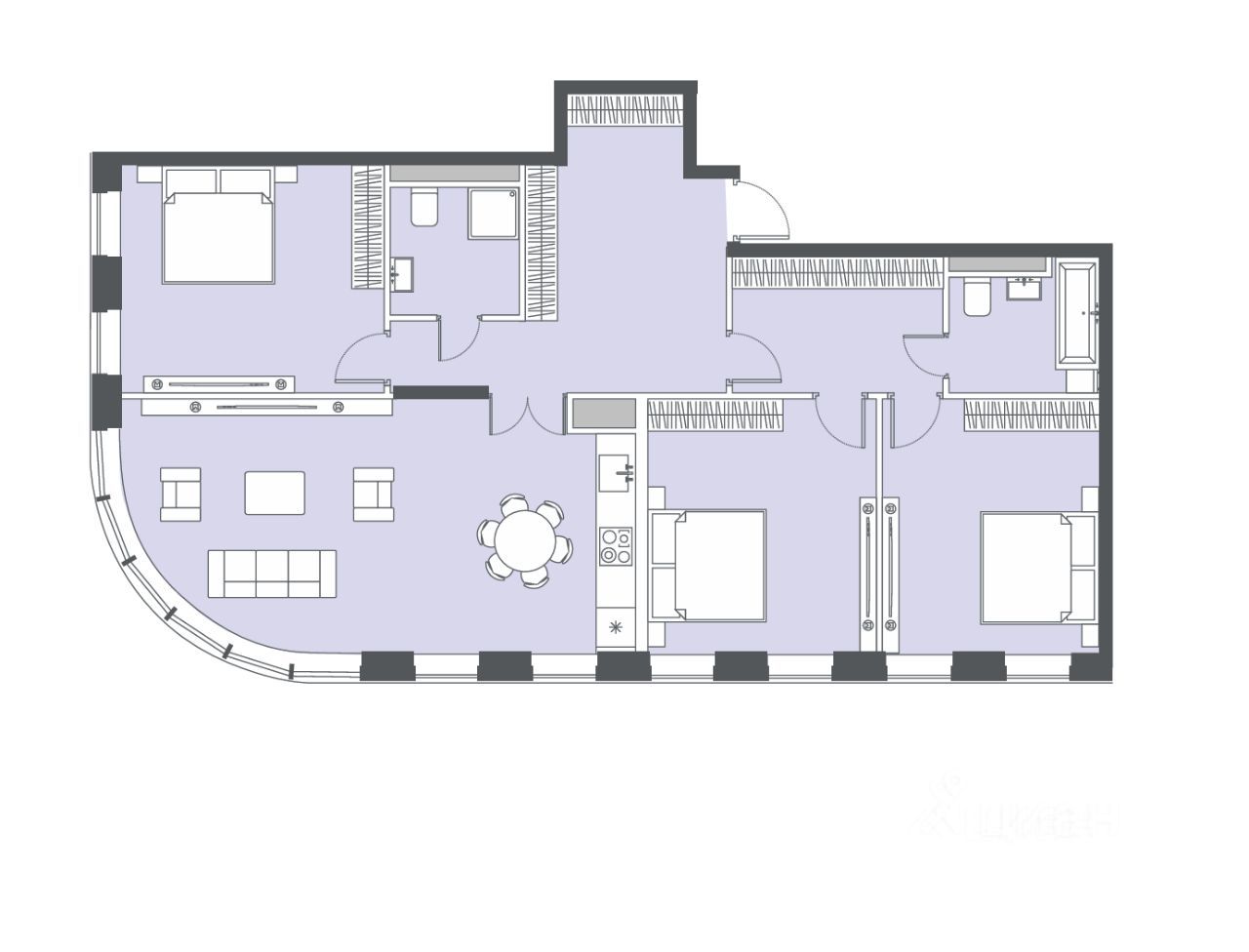Общая площадь 103 кв.м., три спальни и просторная кухня-гостиная, два санузла.