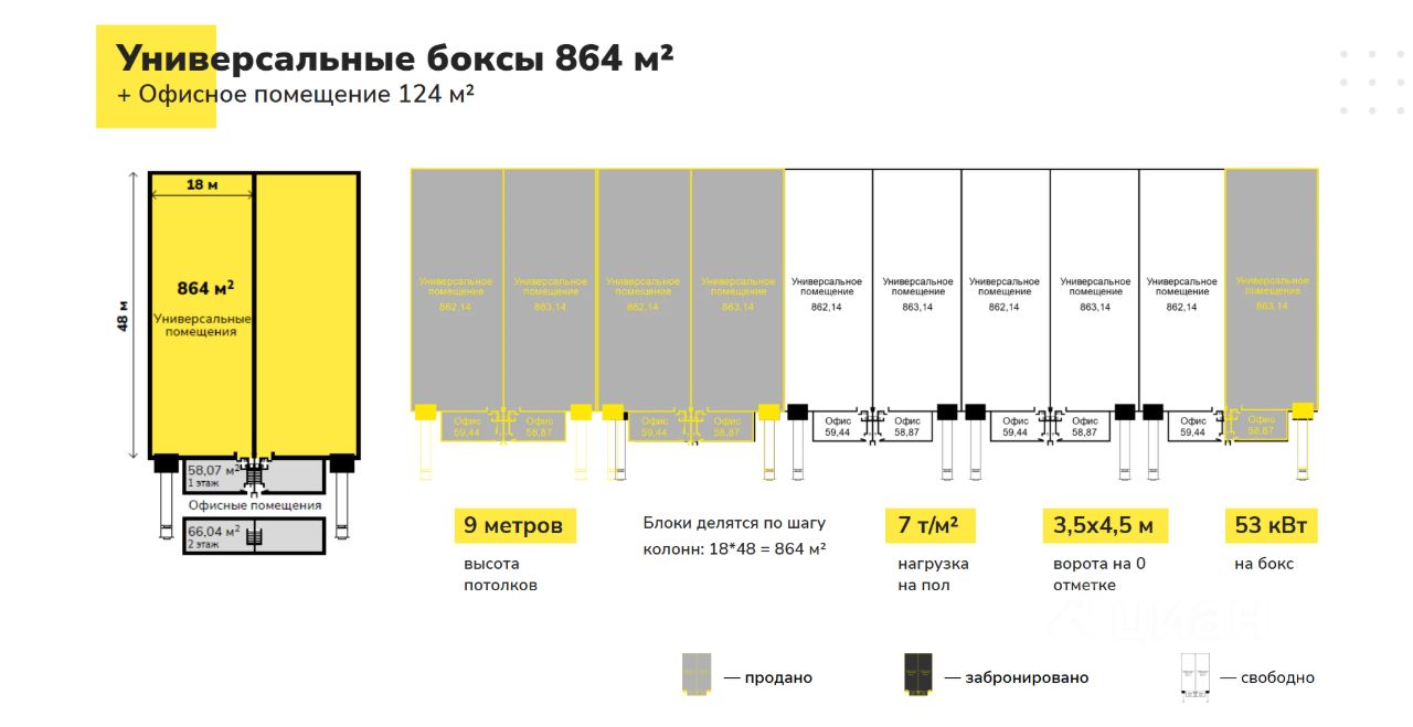 Блоки от 990 м2, в том числе офис с готовым ремонтом 120м2. На блок 1 ворота с электро приводом. Высота потока 9м, нагрузка на пот до 7тн/м2, антипыль. Эл.мощность 53 кВт. На этапе строительства можно учесть индивидуальные потребности к помещению.