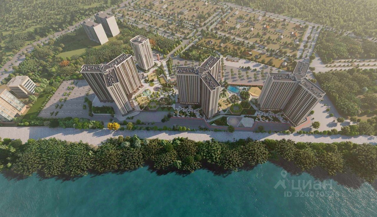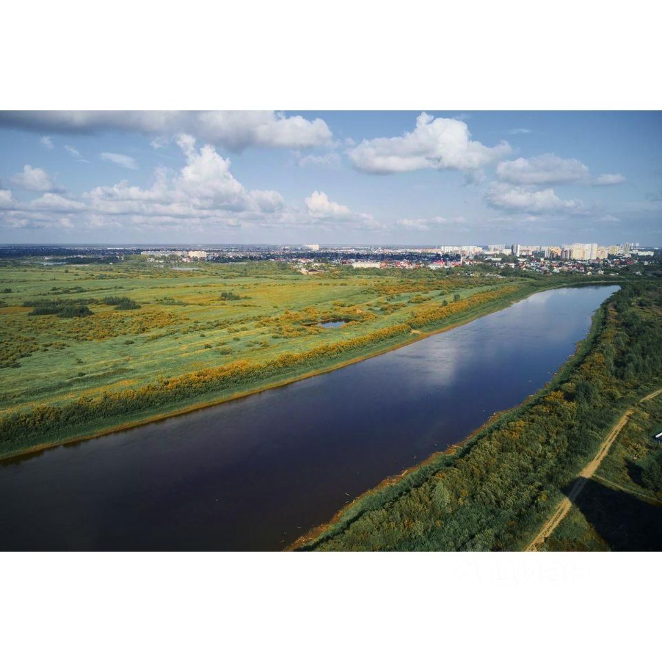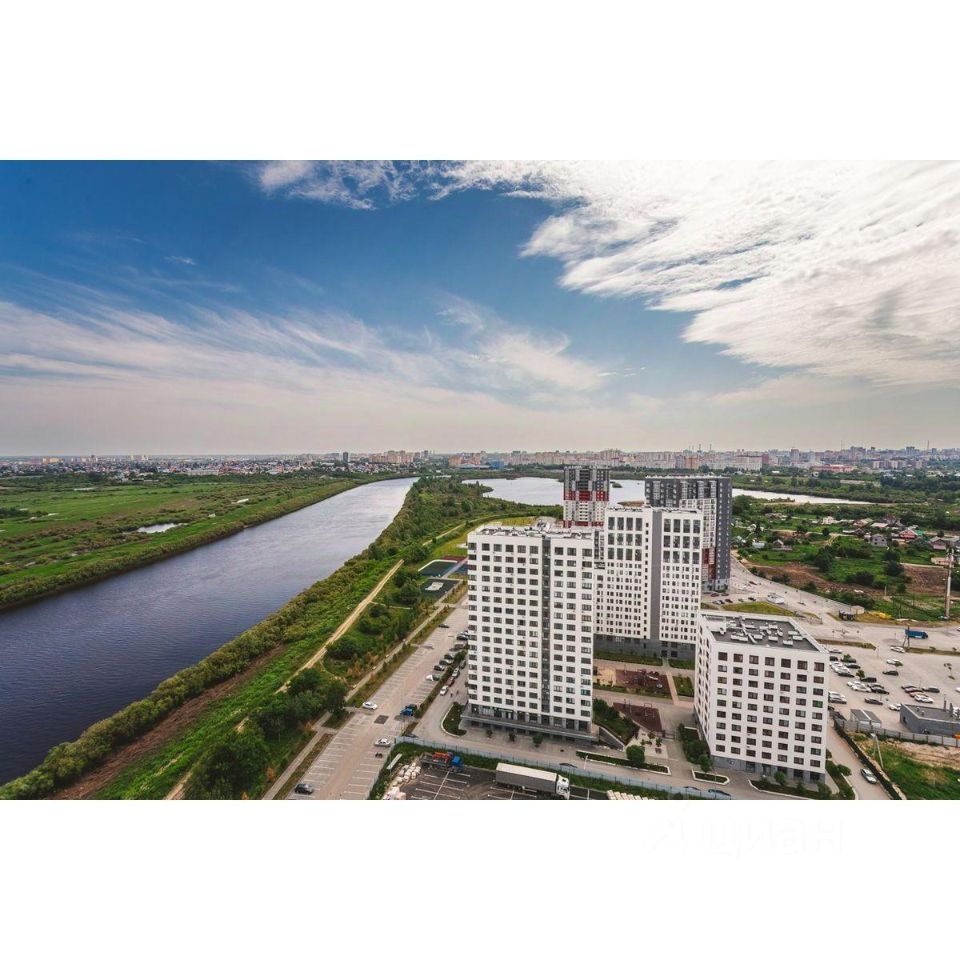 Жилой комплекс на берегу Туры с живописным видом на реку, Мост влюбленных и исторический центр.