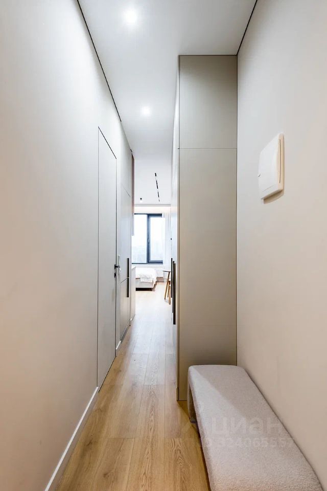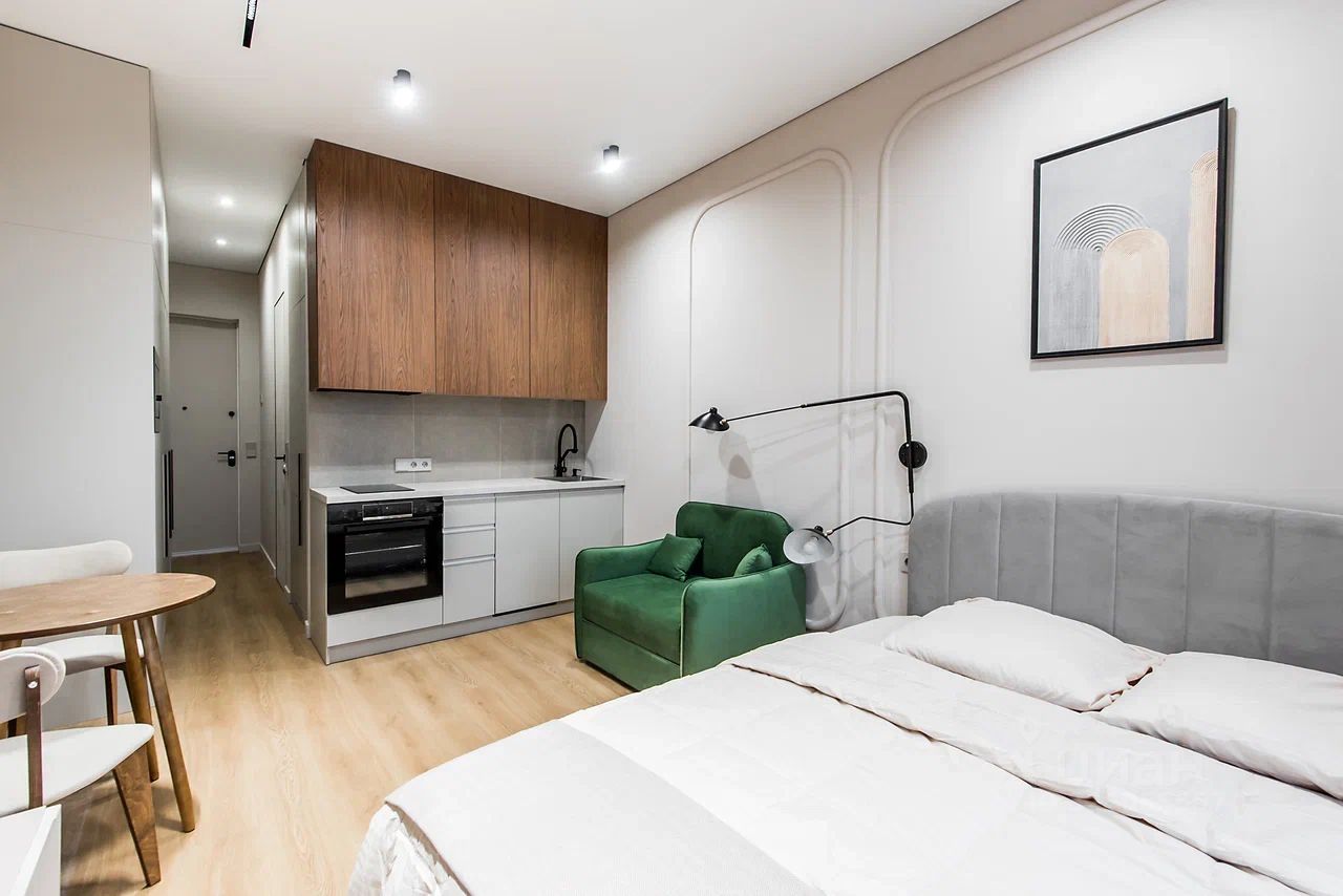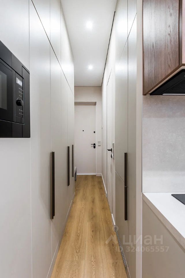 Полностью укомплектован всей необходимой для комфортного проживания мебелью и бытовой техникой. Установлена двуспальная кровать, небольшой диван рядом, много систем хранения — два встроенных шкафа до потолка с антресолями, компактная, но вместительная кухня с полным набором техники в виде посудомоечной машины, духового шкафа, варочной панели, вытяжки, микроволновой печи. В комнате установлен телевизор Яндекс ТВ. В ванной комнате установлен большой шкаф в потолок для хранения хозяйственных вещей, а также стиральная машина.