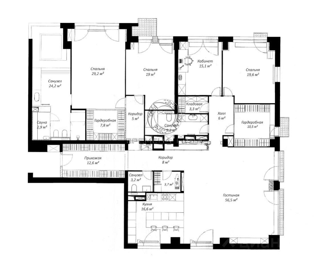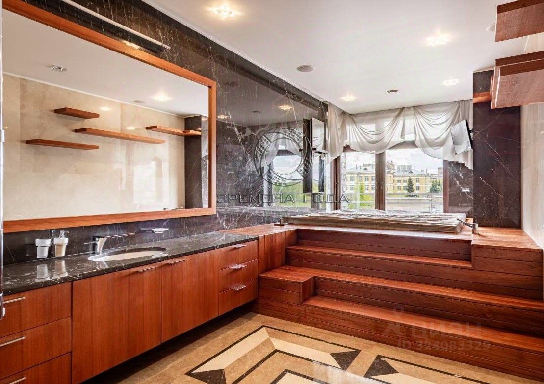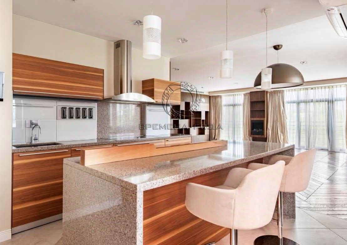 Планировочное решение: кухня с обеденной зоной и гостиной, мастер-спальня со своим санузлом, сауной, джакузи и гардеробной комнатой, две изолированные спальни, кабинет, два санузла, гардеробная комната, кладовая, постирочная, прихожая с гардеробом.