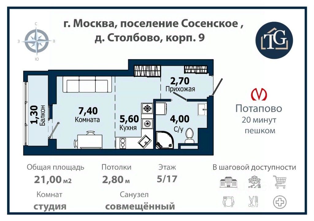 В продаже по переуступке студия в ЖК Бунинские кварталы.