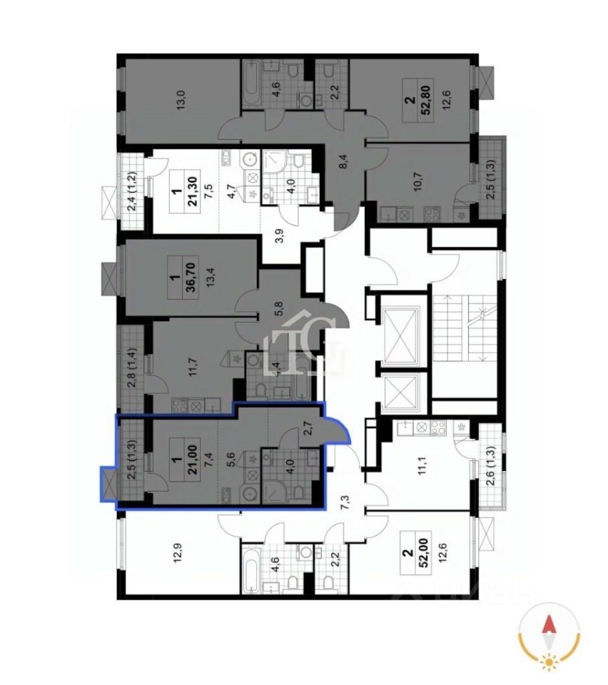 Комфортная планировка — комната эргономичной формы, в с/у встает стиральная машина. Есть лоджия 2,5 метра. Всего 5 квартир на этаже.