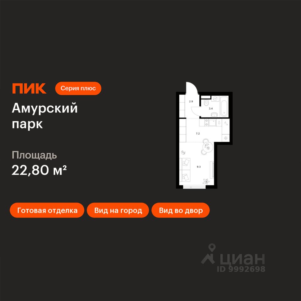 Продаётся квартира-студия площадью 22,8 кв.м на 10 этаже 27 этажного дома (Корпус 4.5, Секция 6) проекта ПИК Амурский парк. Светлый просторный подъезд на уровне земли, функциональная планировка, большие окна, c отделкой.