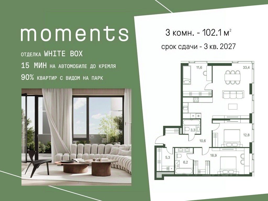 Продается 3-к. квартира номер 234 общей площадью 102.1 кв.м. на 18-м этаже 30 этажного дома, корпус 2.1. С отделкой White Box.
