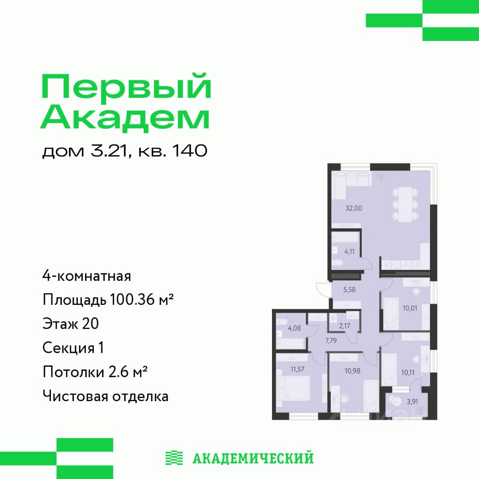 Продается 4-комнатная квартира площадью 100.36 кв.м. от девелопера ''Академический'' в жилом квартале ''Первый Академ''. Срок сдачи дома в 2028 году. Выгоды и скидка напрямую от застройщика.
