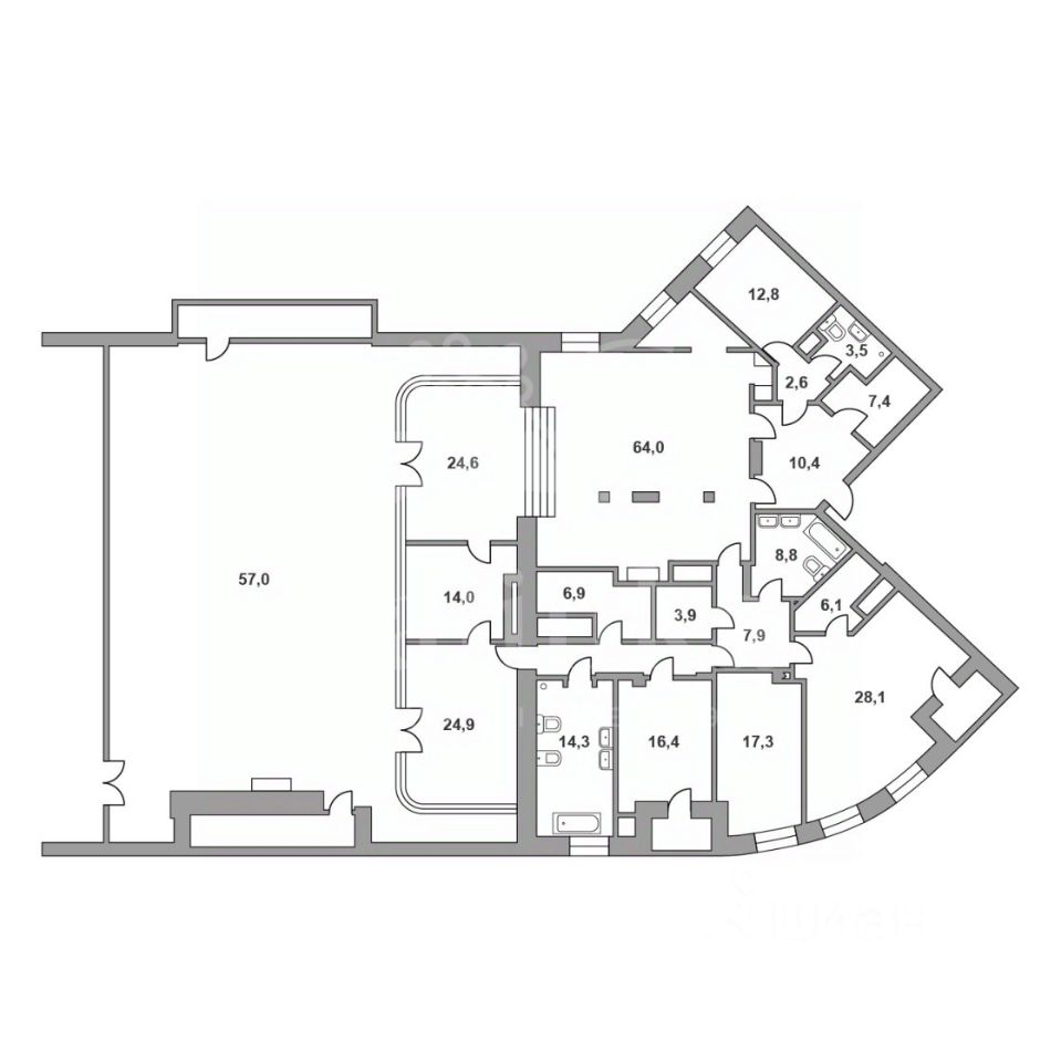 Просторный, светлый и функциональный трёхсторонний пентхаус площадью 515 кв. м. В общую площадь входят 318 кв. м внутренних помещений, терраса 192 кв. м и две лоджии по 5 кв. м. Из квартиры открываются великолепные панорамные виды на обширный лесной массив Покровское-Стрешнево и Химкинское водохранилище.