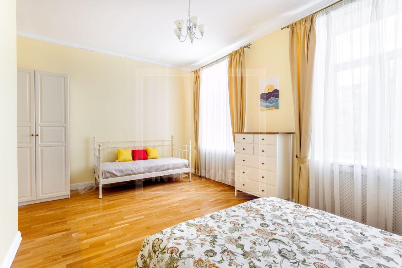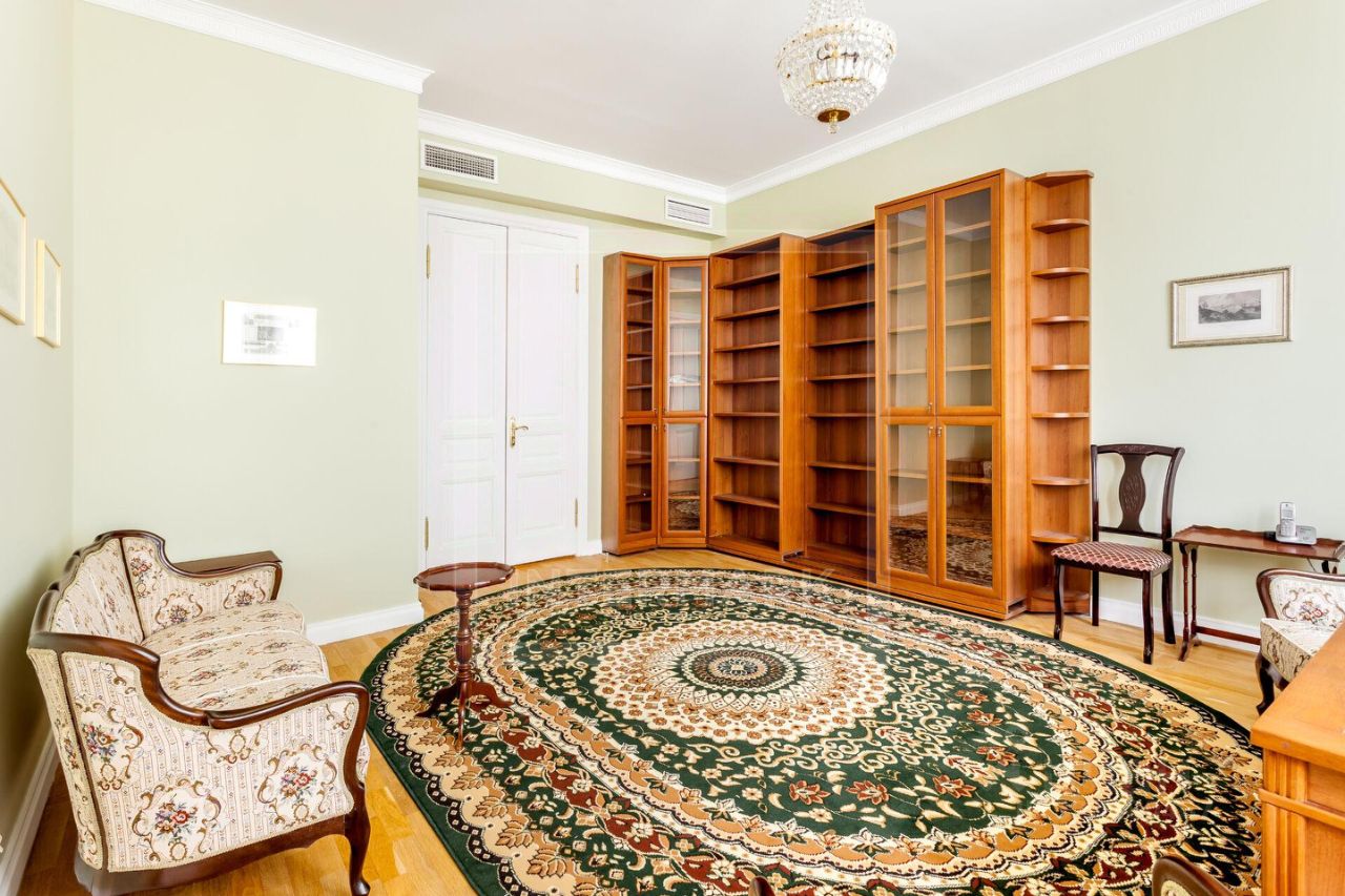 ID 10155: Освобождается с 26 ноября 25го! Семейная 6-комнатная квартира в историческом доме, в самом центре Москвы. Выполнен качественный ремонт в светлых тонах. Квартира предлагается полностью оборудованной всей необходимой бытовой техникой, как с мебелью, так и без мебели. Квартира оснащена кондиционированием, бойлером, высокоскоростным интернетом, спутниковым телевидением, установлены посудомоечная и стиральная машины, есть подогрев полов, действующий камин, ванна с джакузи, видеодомофон. Общая площадь 340 кв. м. Планировка: просторная гостиная комната, столовая, 5 спален, отдельная кухня с выходом на черный ход, холл, постирочная, 2 ванные комнаты, гостевой туалет, гардеробная комната, дополнительное помещение - комната для хранения вещей 9 кв.м. Окна выходят на 2 стороны, в тихий двор. Дом с отремонтированным фасадом огорожен, круглосуточная охрана. Есть парковочное место во дворе под круглосуточной охраной и видеонаблюдением. Дом расположен в 3-х минутах от метро Библиотека им. Ленина, в непосредственной близости от Кремля. Развитая инфраструктура района, в шаговой доступности: многочисленные уютные кафе, продуктовые магазины, элитные рестораны, салоны красоты, музеи, театры и галереи.