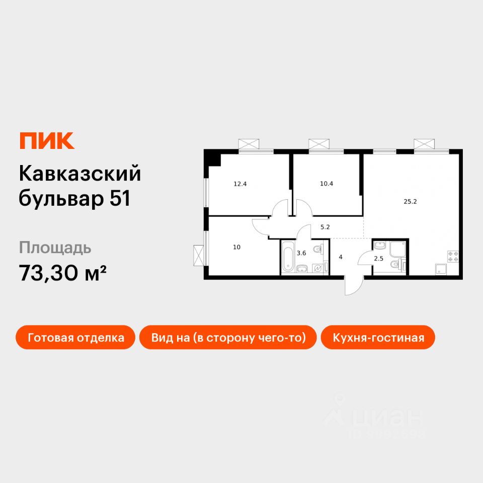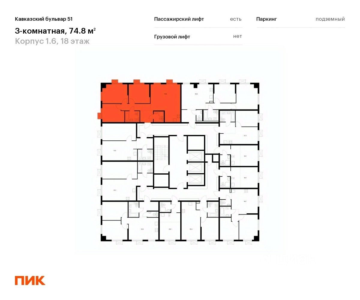 Продаётся 3-комн. квартира площадью 73,3 кв.м на 18 этаже 23 этажного дома (Корпус 1.6, Секция 2) проекта ПИК Кавказский бульвар 51. Светлый просторный подъезд на уровне земли, функциональная планировка, большие окна, c отделкой.