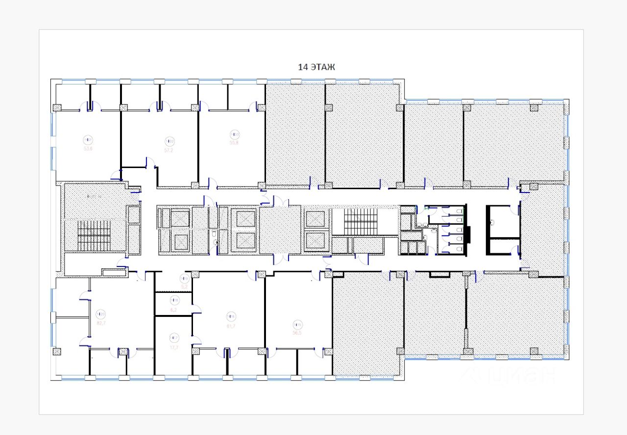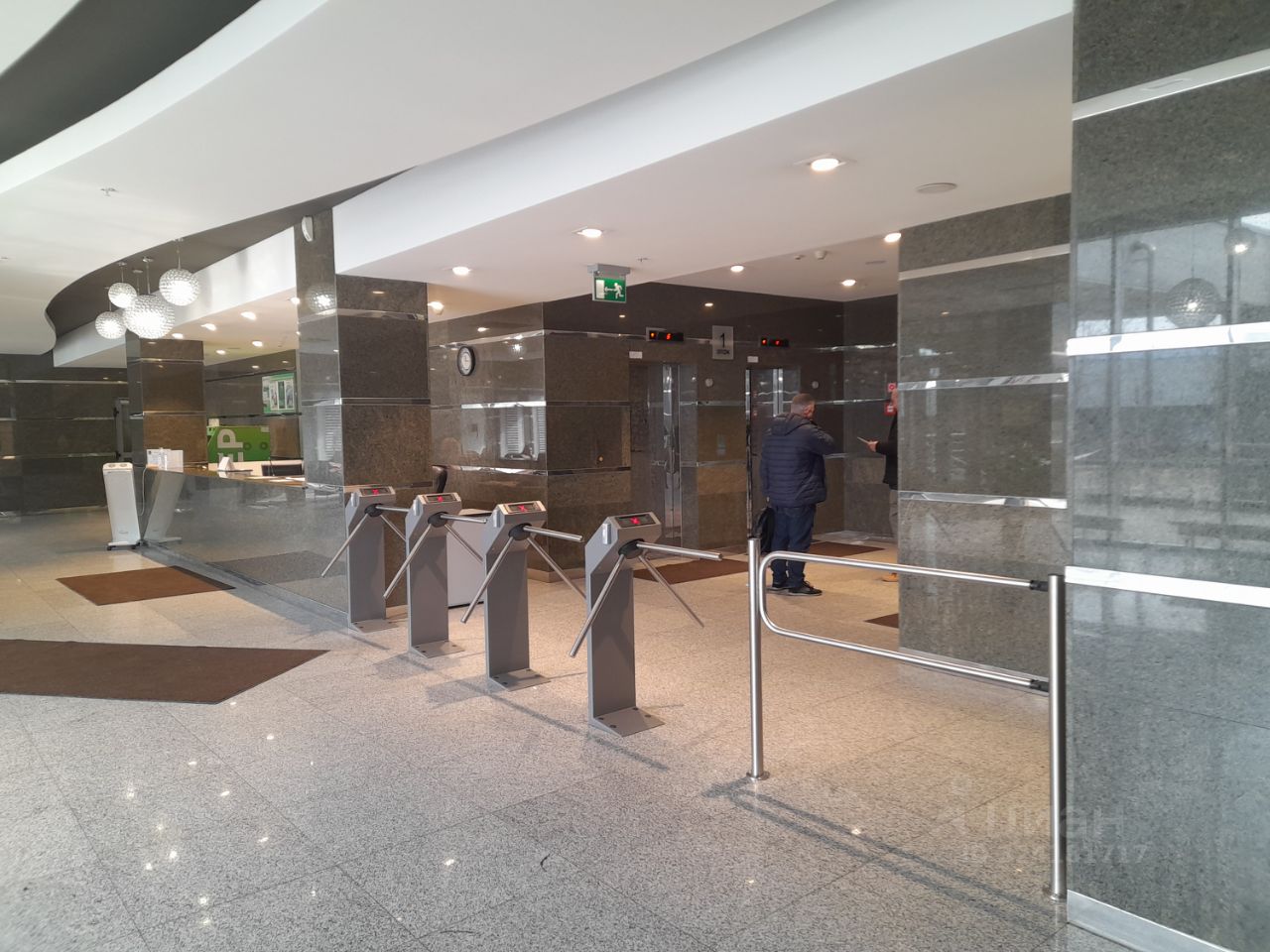 -4 пассажирских лифта, внутри в коридоре грузовой лифт, выход на общую лестницу