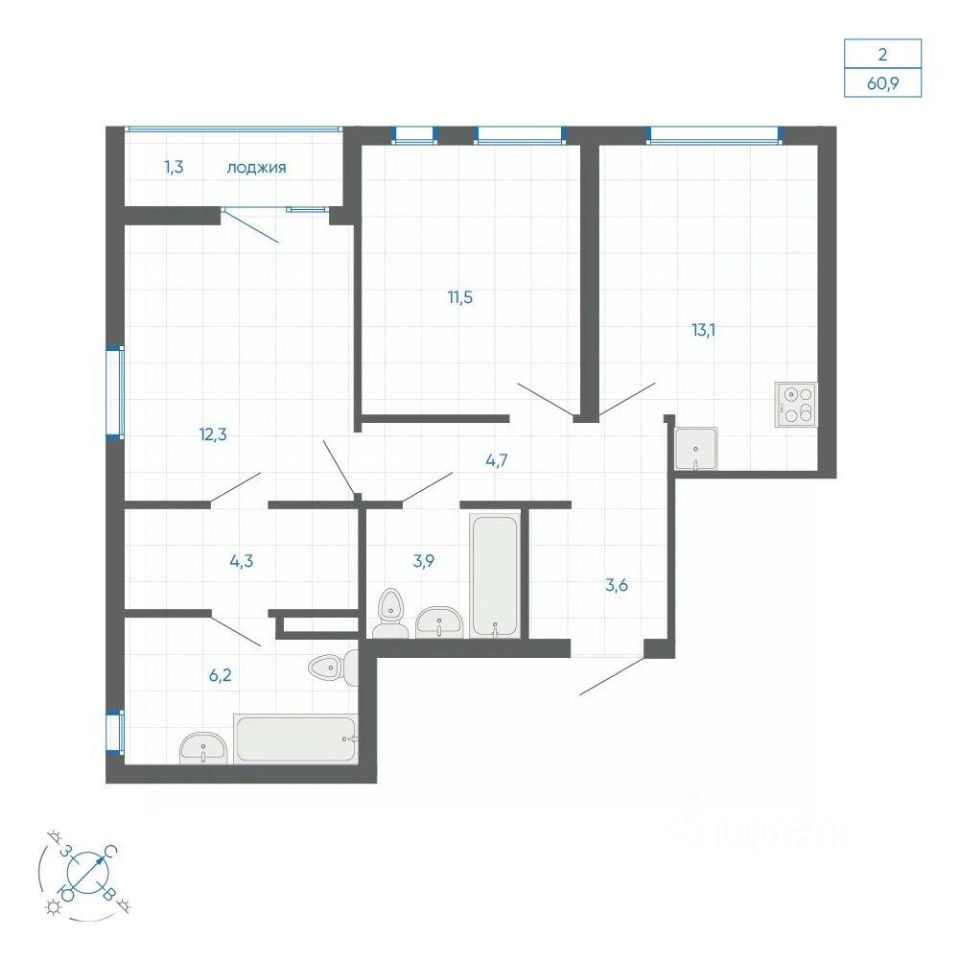 Общая площадь60,9 м2