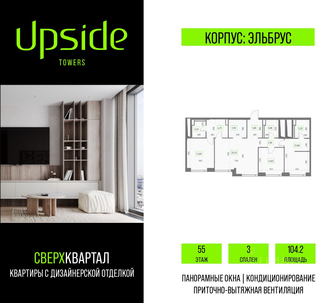 Upside Towers - технологичный квартал строится в динамично развивающемся Бутырском районе, в 3 мин. от метро, в 5 мин. от ТТК. На территории 7 га возводится 5 высотных башен от 19 до 58 этажей, названных в честь главных вершин земли. Квартиры с панорамными окнами в пол, высокими потолками и современными инженерными решениями. Благоустроенная зеленая территория включает: приватные дворы, природный комплекс, прогулочный бульвар, ландшафтный парк 2,5 га с сенсорным садом и многофункциональными игровыми и спортивными площадками.