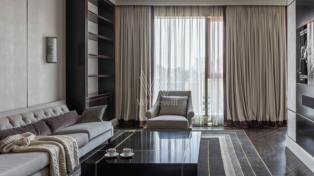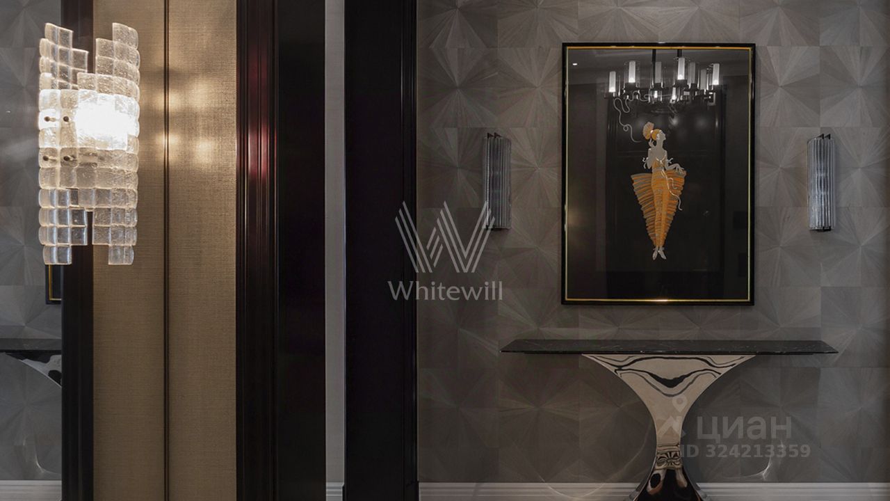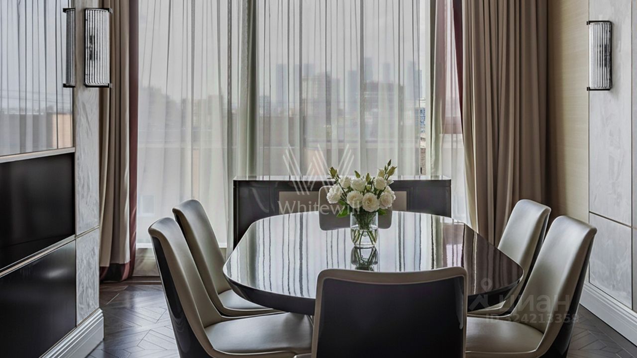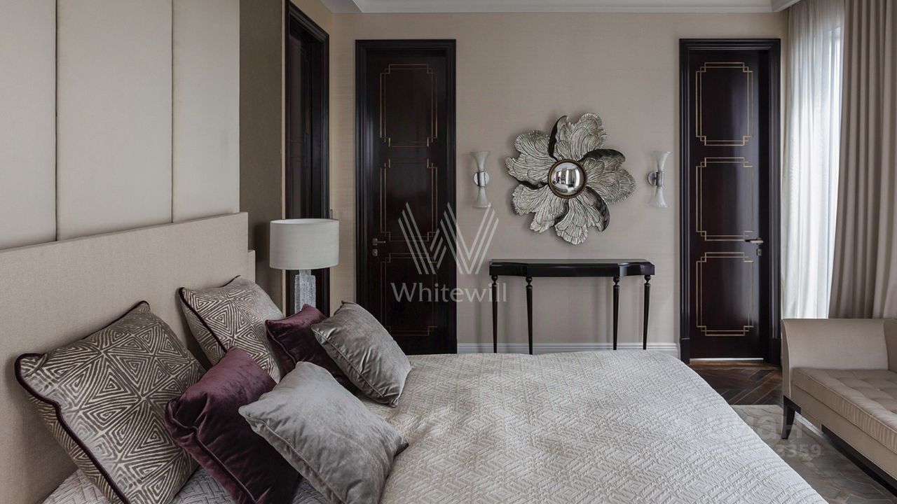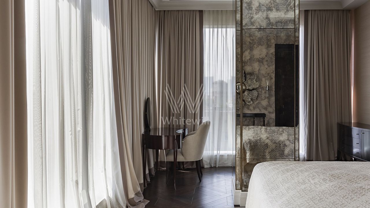Просторная квартира с тремя спальнями в комплексе премиум-класса ''Четыре ветра'' в Тверском районе. Квартира площадью 186 м² расположена на девятом этаже. Интерьер оформлен в современном стиле в лаконичных тёплых тонах, в отделке использован натуральный мрамор, ценные породы дерева, шелк, кожа ската.