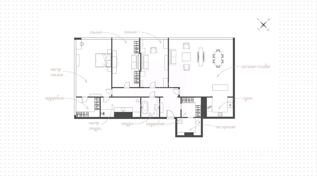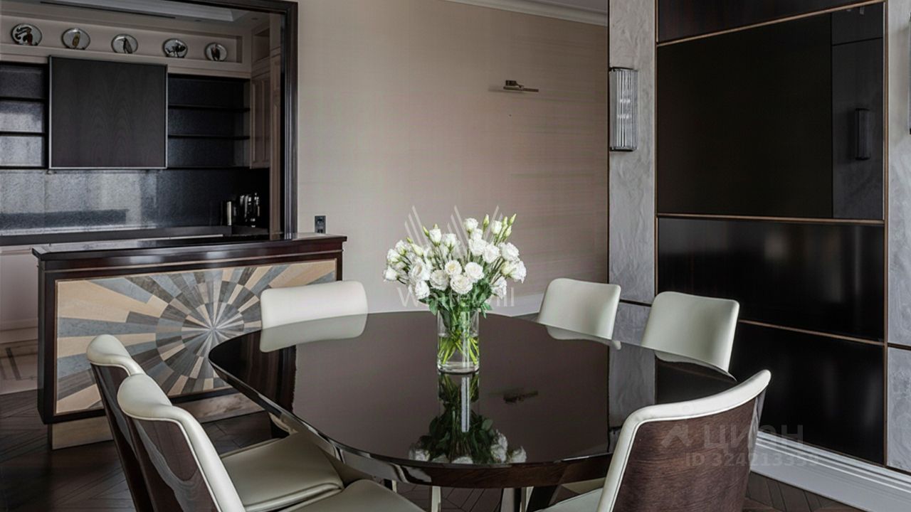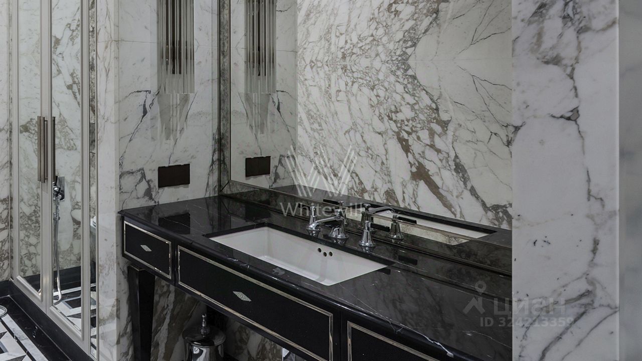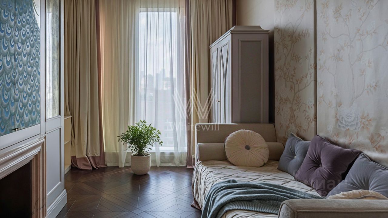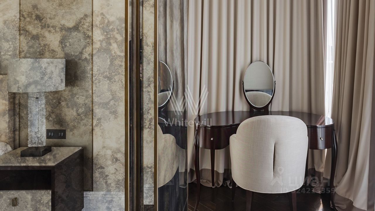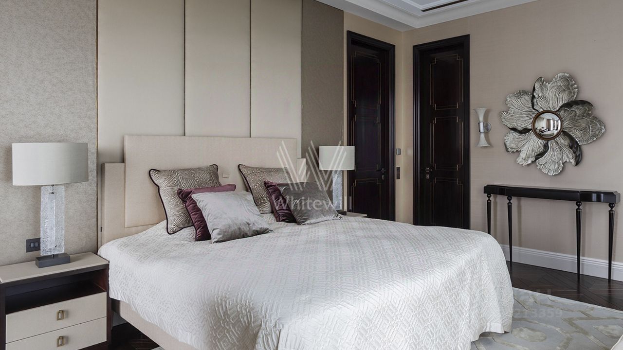 Просторная квартира с тремя спальнями в комплексе премиум-класса ''Четыре ветра'' в Тверском районе. Квартира площадью 186 м² расположена на девятом этаже. Интерьер оформлен в современном стиле в лаконичных тёплых тонах, в отделке использован натуральный мрамор, ценные породы дерева, шелк, кожа ската.