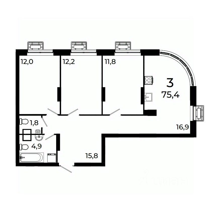 Продается 3-комнатная квартира площадью 75,9 кв.м на 2 этаже 19 этажного дома 3 в ЖК Сормово Парк.