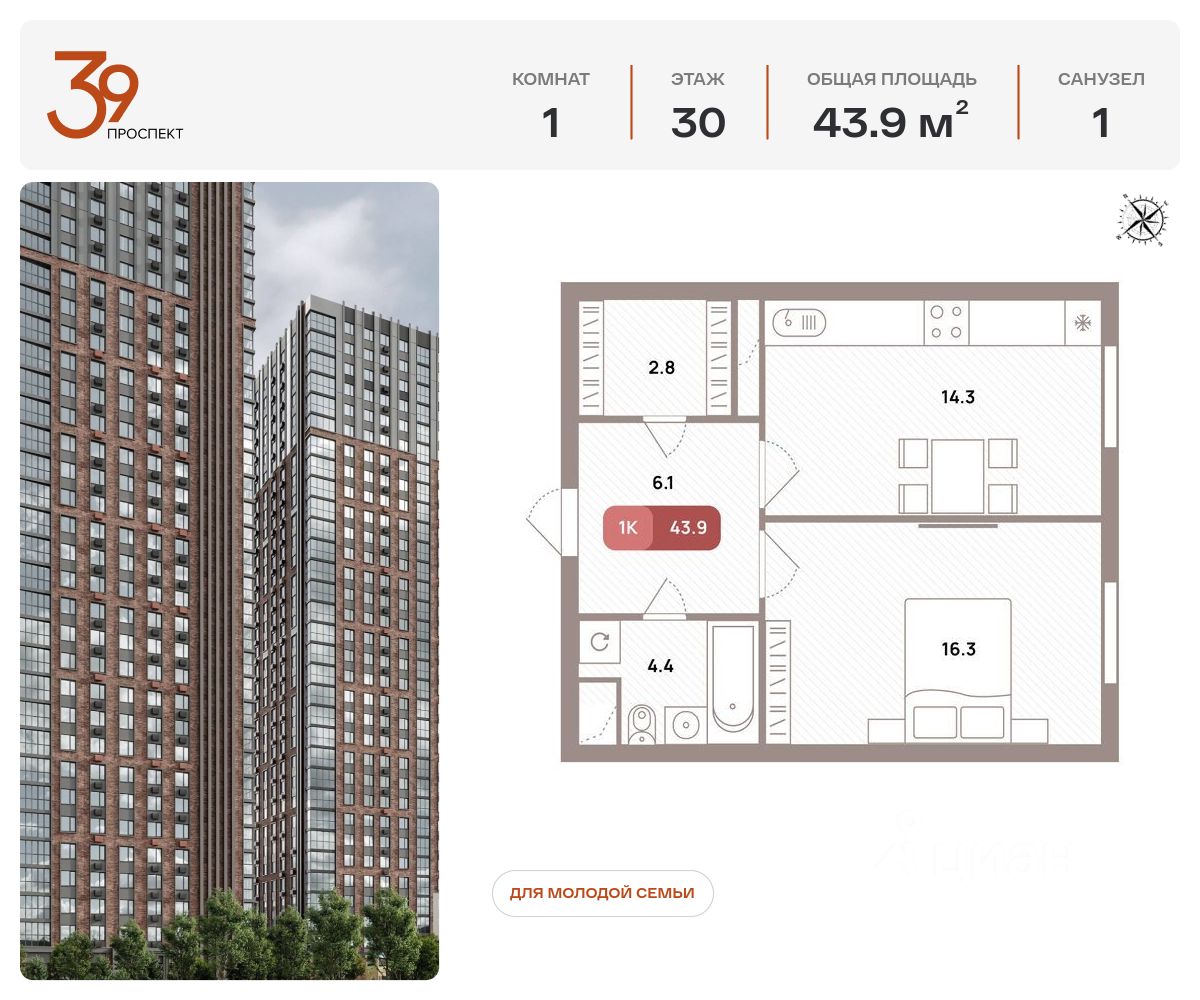 Общая площадь43,9 м2