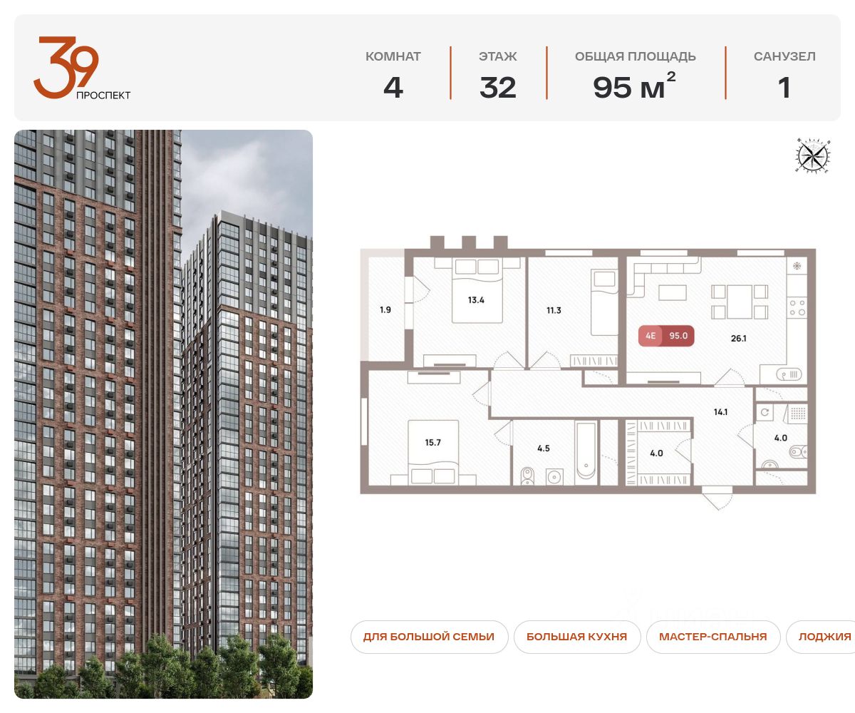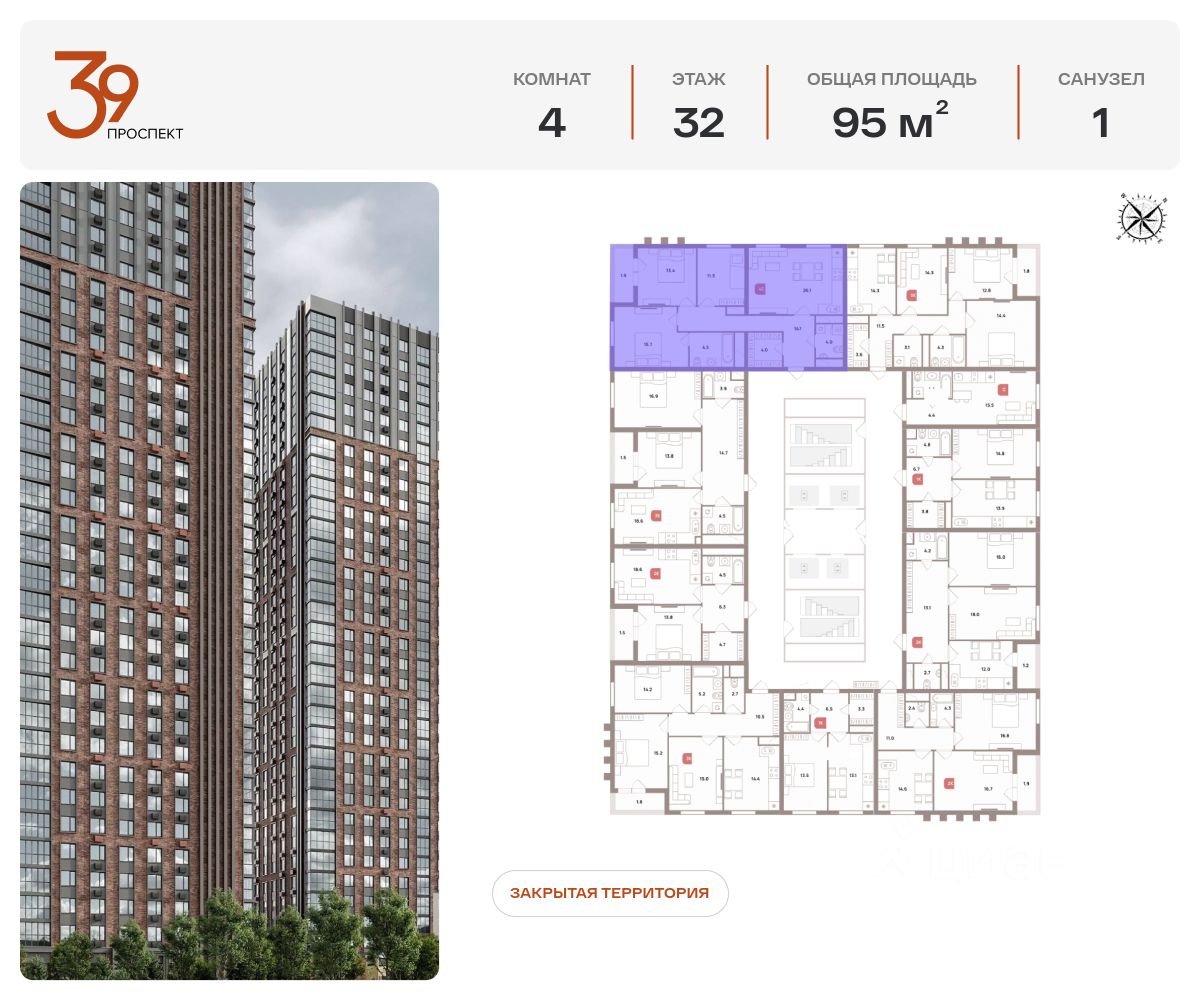 Продается четырехкомнатная квартира в ЖК ''Проспект 39'' по адресу Москва, ЮВАО, Рязанский проспект, вл. 39, к. 1. Общая площадь квартиры - 95,00 кв.м., этаж 32. Стоимость квартиры - 34 964 790 р. Продаётся без отделки.