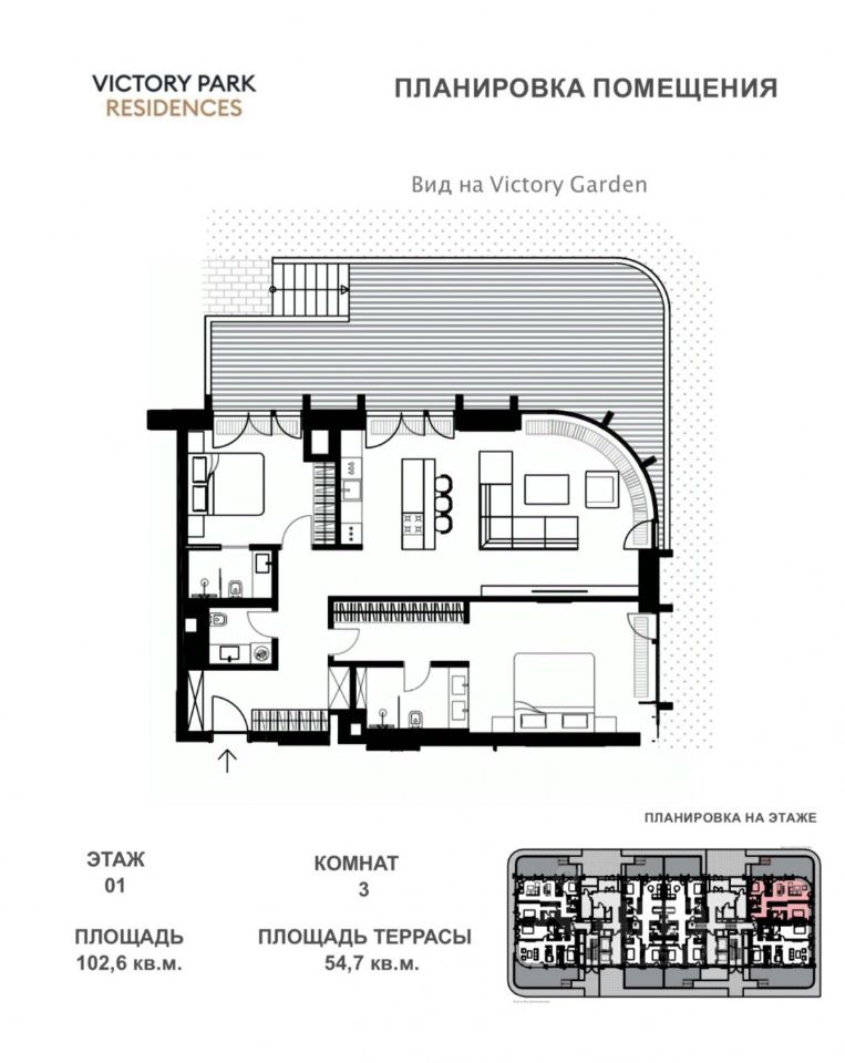 Эффективная планировка: - кухня-гостиная с закругленным угловым панорамным окном, - мастер-спальня со своим санузлом и гардеробной, - вторая спальня со своим санузлом, - гостевой санузел, - собственное патио 54.7 кв. м. Вид в красивый приватный двор Victory Garden.