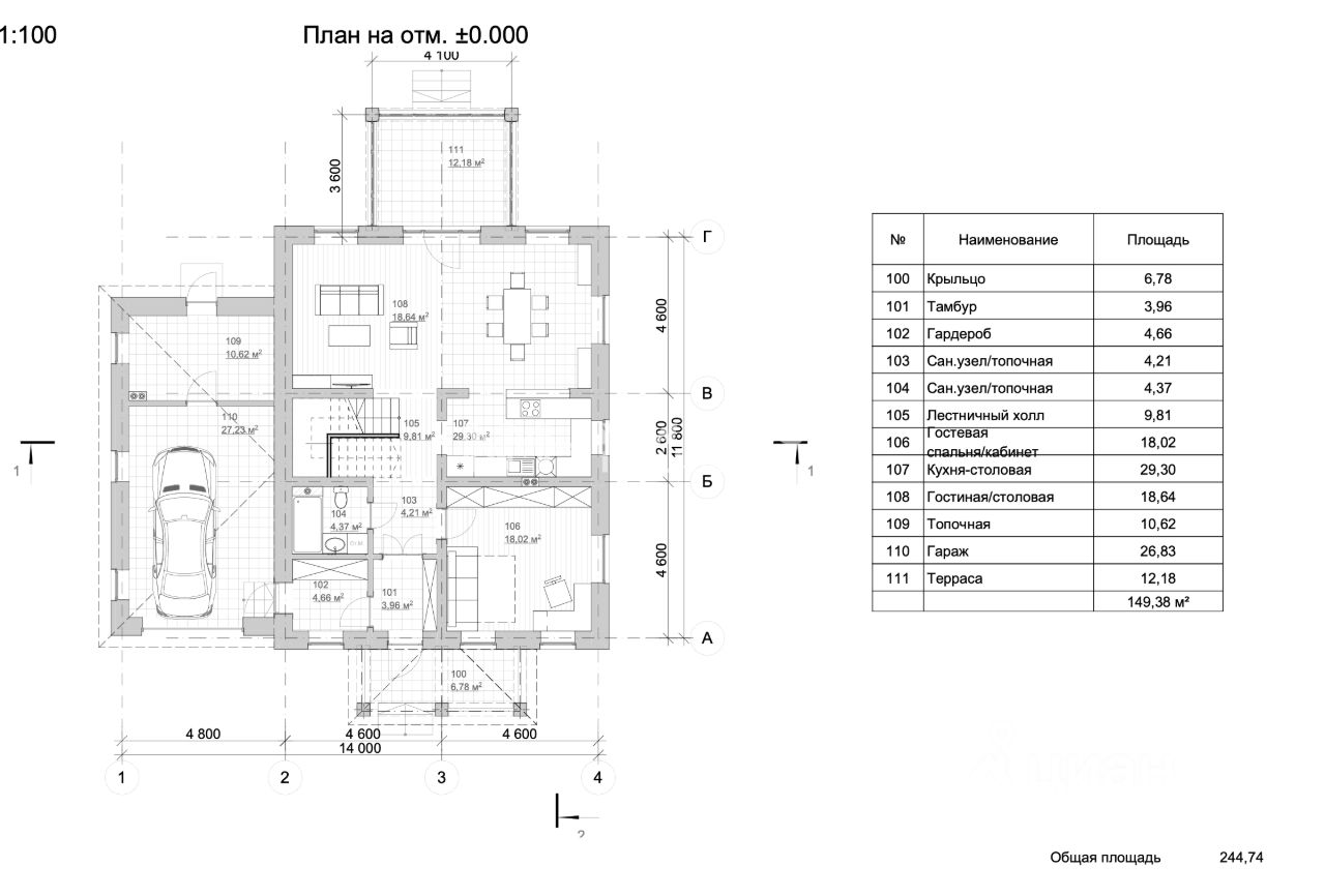 Первый этаж: входная группа, холл, гостиная с панорамными окнами, кухня-столовая, кабинет, с/у, гараж, котельная.