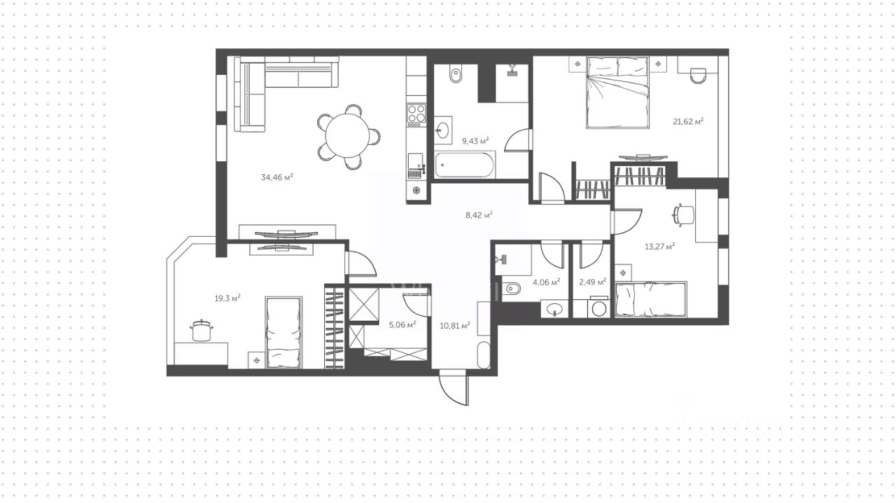 Просторная квартира с тремя спальнями общей площадью 130 м² в комплексе ''Донской Олимп''. Квартира с готовой дизайнерской отделкой расположена на пятом этаже. Функциональная планировка включает кухню-гостиную, мастер-спальню со своей ванной комнатой, две спальни, санузел с душевой, постирочную, гардеробную и холл. Окна ориентированы на две стороны света.