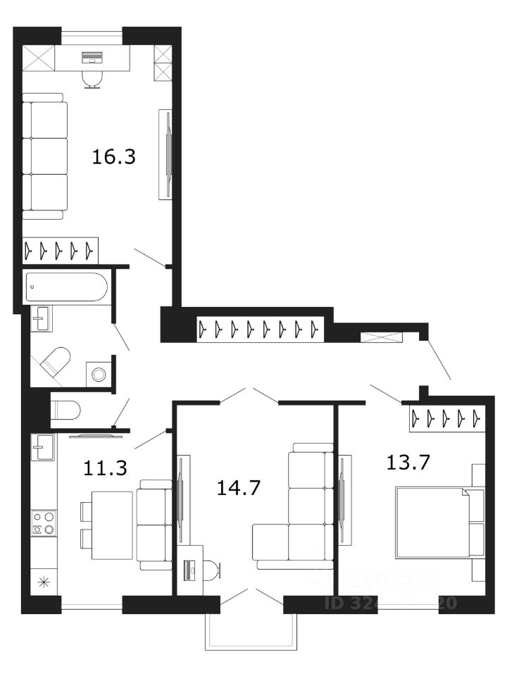 Три изолированные комнаты 13,7 кв.м, 14,7 кв.м, 16