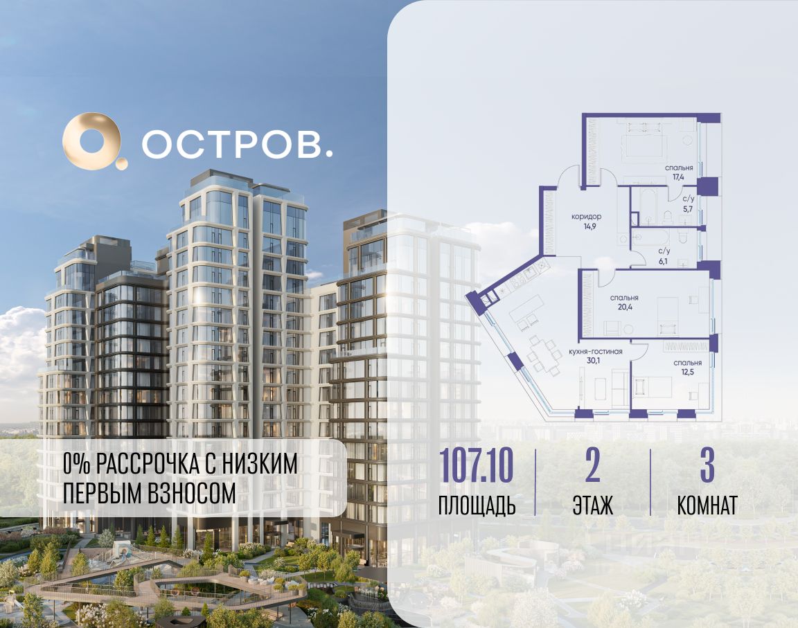Продаётся трехкомнатная квартира от застройщика: общая площадь 107.10 м², жилая 50.30 м², кухня 30.10 м², 2, жилой квартал ''Остров 12'', корпус 1 (12.1 квартал) (секция 1). срок сдачи: 4-кв. 2025. , 2 санузла: 2 совмещенных. В жилой зоне 2 больших окна на одну сторону, хорошая инсоляция.