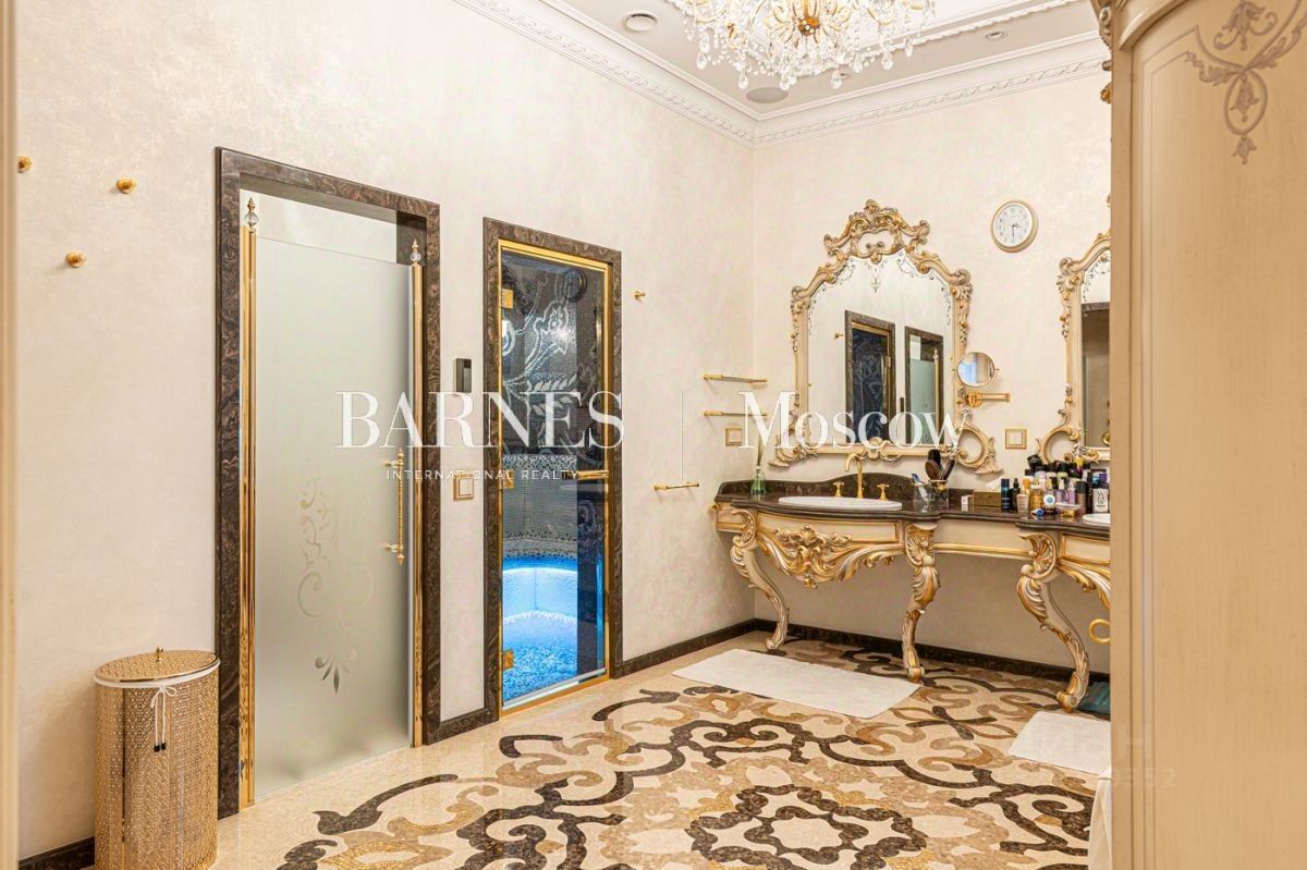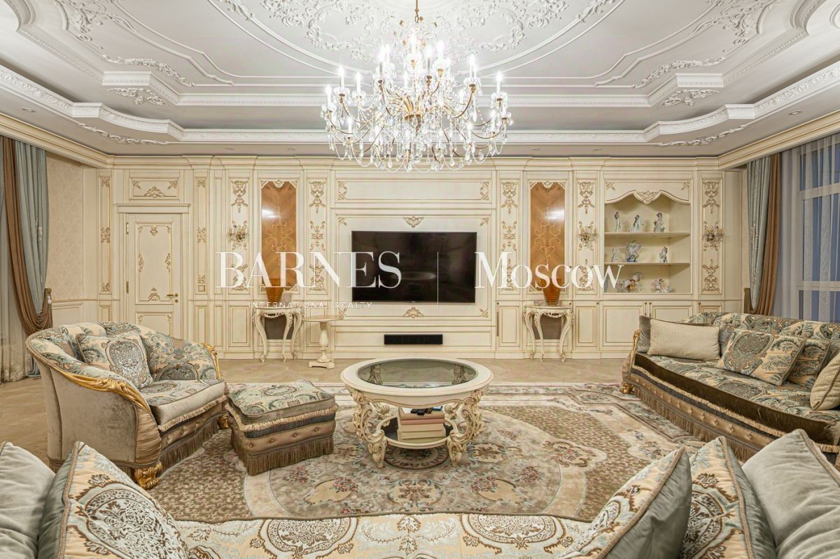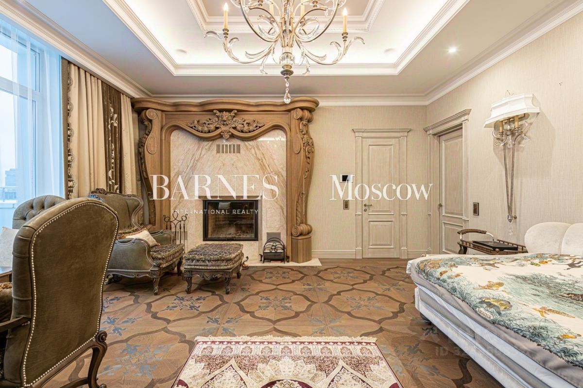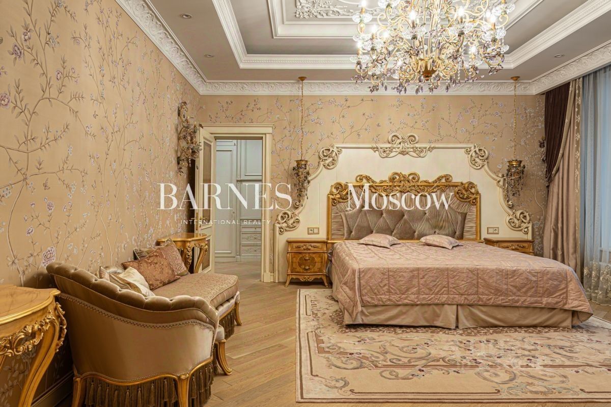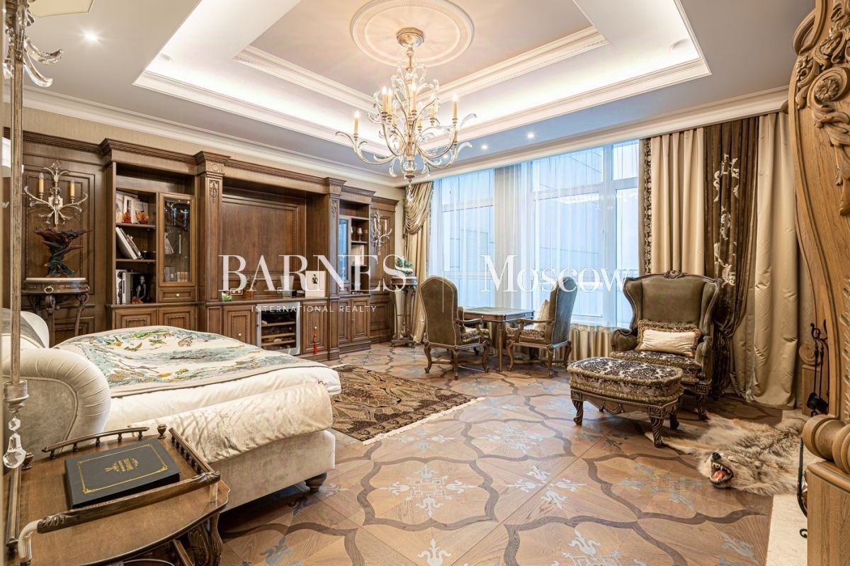 Выполнена авторская отделка в классическом стиле с использованием дорогостоящих материалов (натуральный мрамор, дубовый пол, шелковые обои). Продуманный до мелочей интерьер дополнен мебелью, изготовленной на заказ, и техникой премиальных брендов.