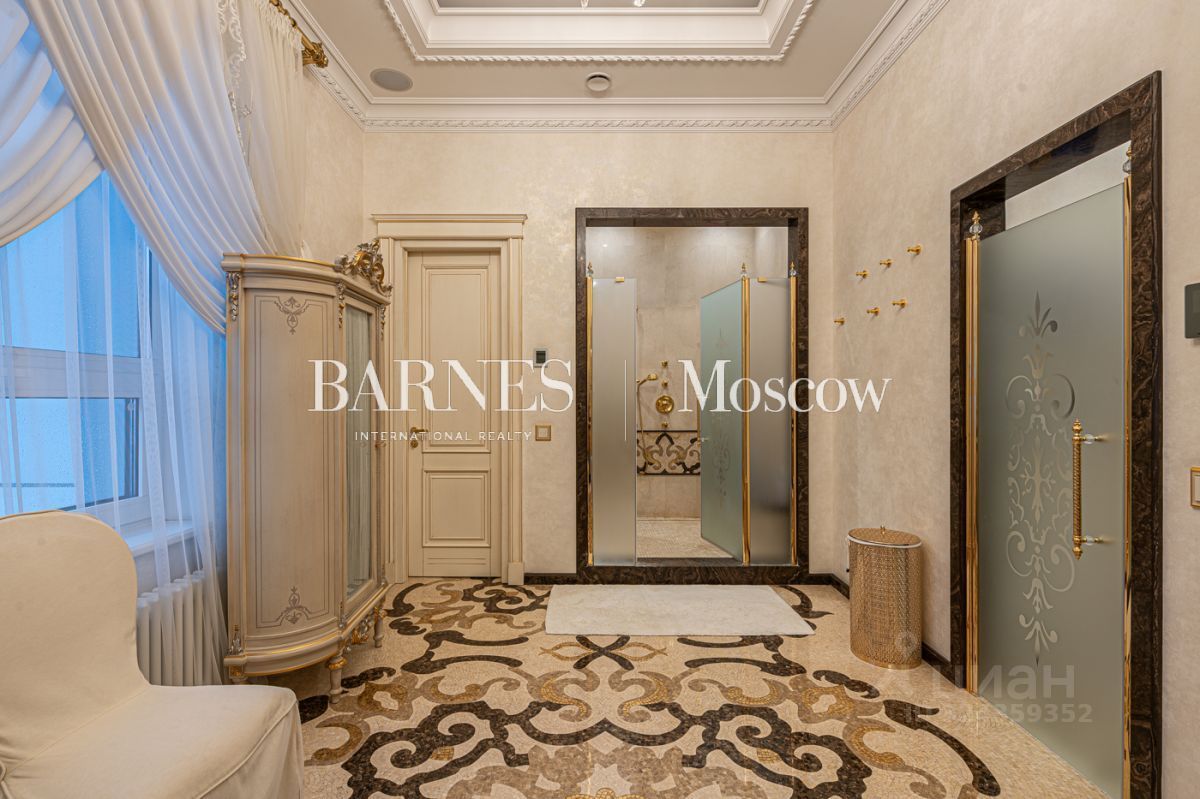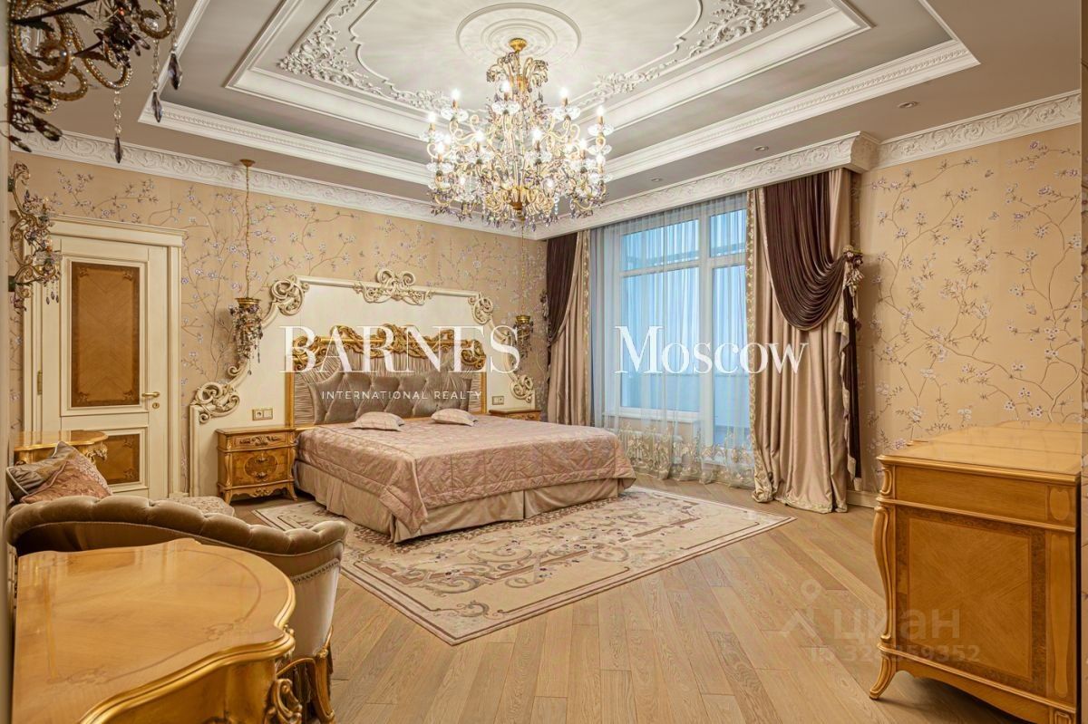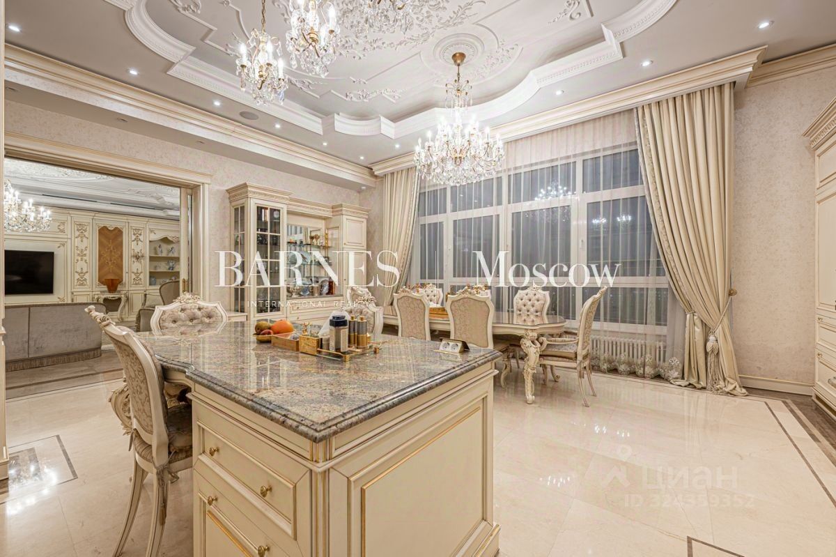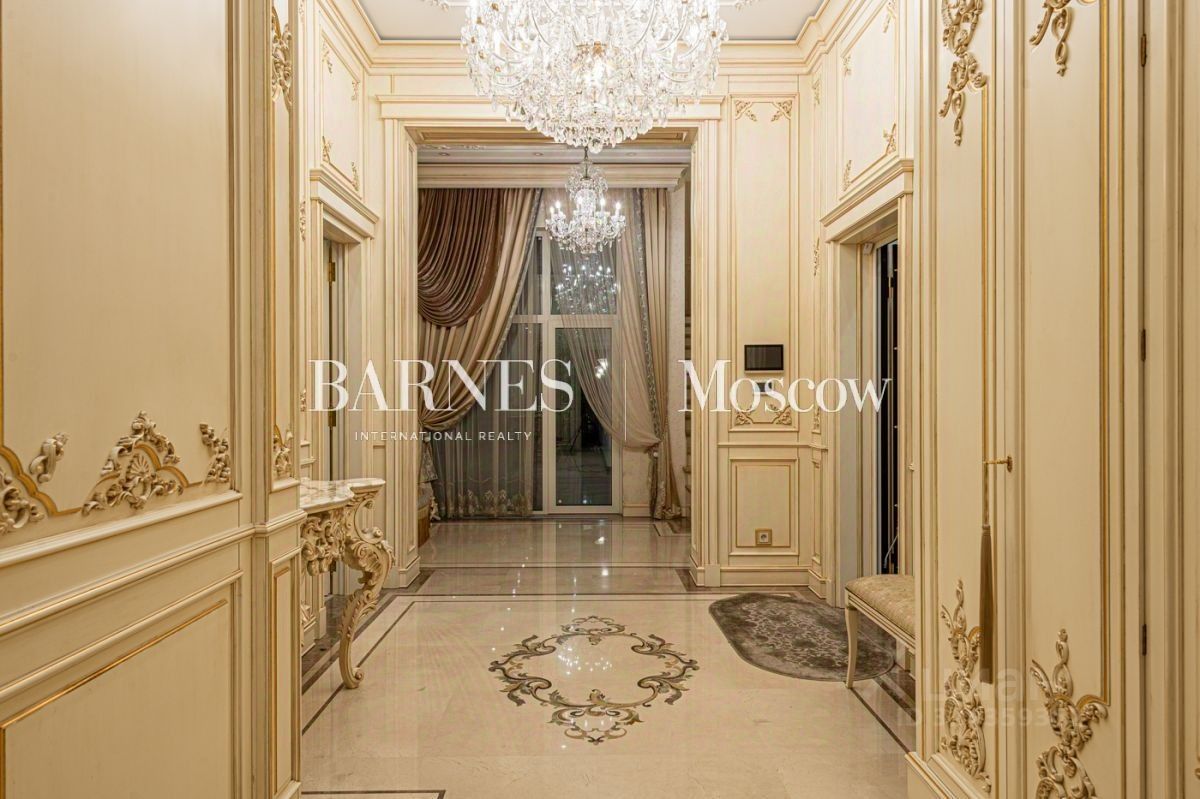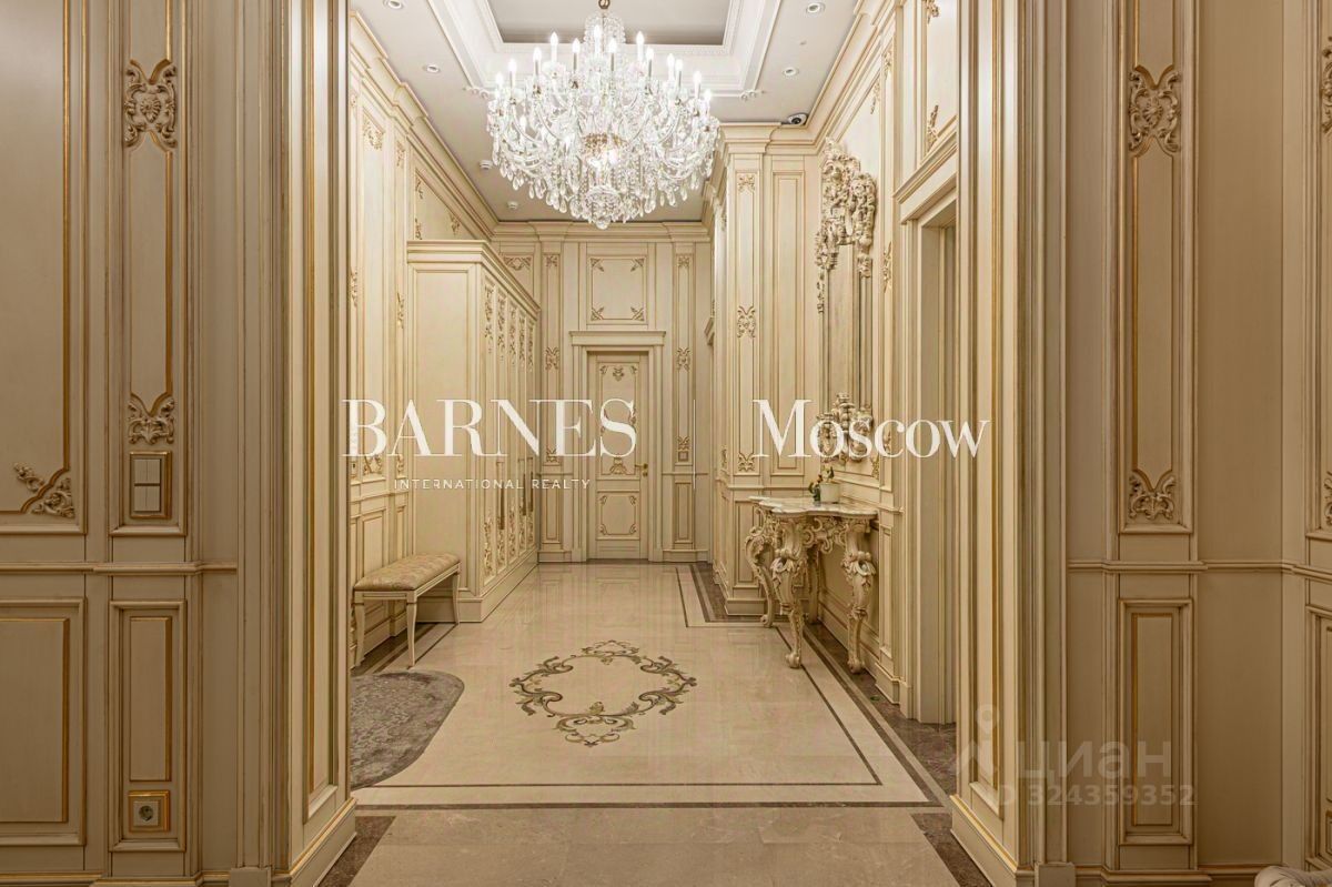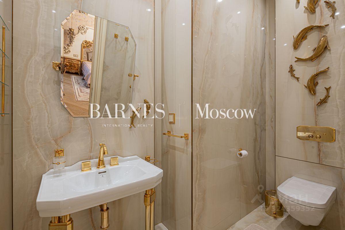 Выполнена авторская отделка в классическом стиле с использованием дорогостоящих материалов (натуральный мрамор, дубовый пол, шелковые обои). Продуманный до мелочей интерьер дополнен мебелью, изготовленной на заказ, и техникой премиальных брендов.