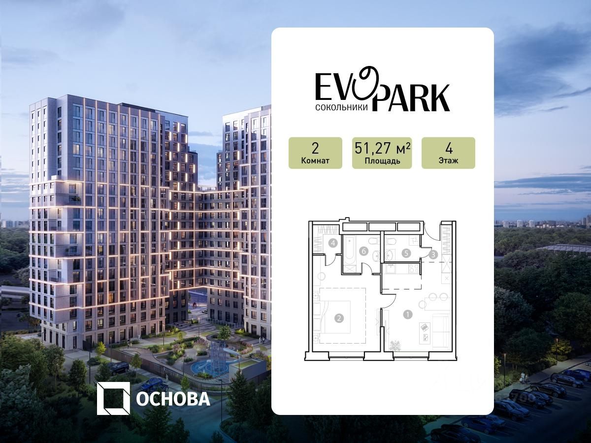 Продаются 2-к апартаменты площадью 51.27 кв.м. на 4-м этаже 20 этажного дома в EVOPARK Сокольники от ГК ОСНОВА.